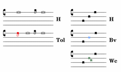 Die traditio occidentalis gruppiert die Töne der 6-stufigen Neume + unisonische Clivis ( = 7 Stufen) anders: ClvSpp + Trc 4 + 3 Stufen ( = 7 Stufen ).