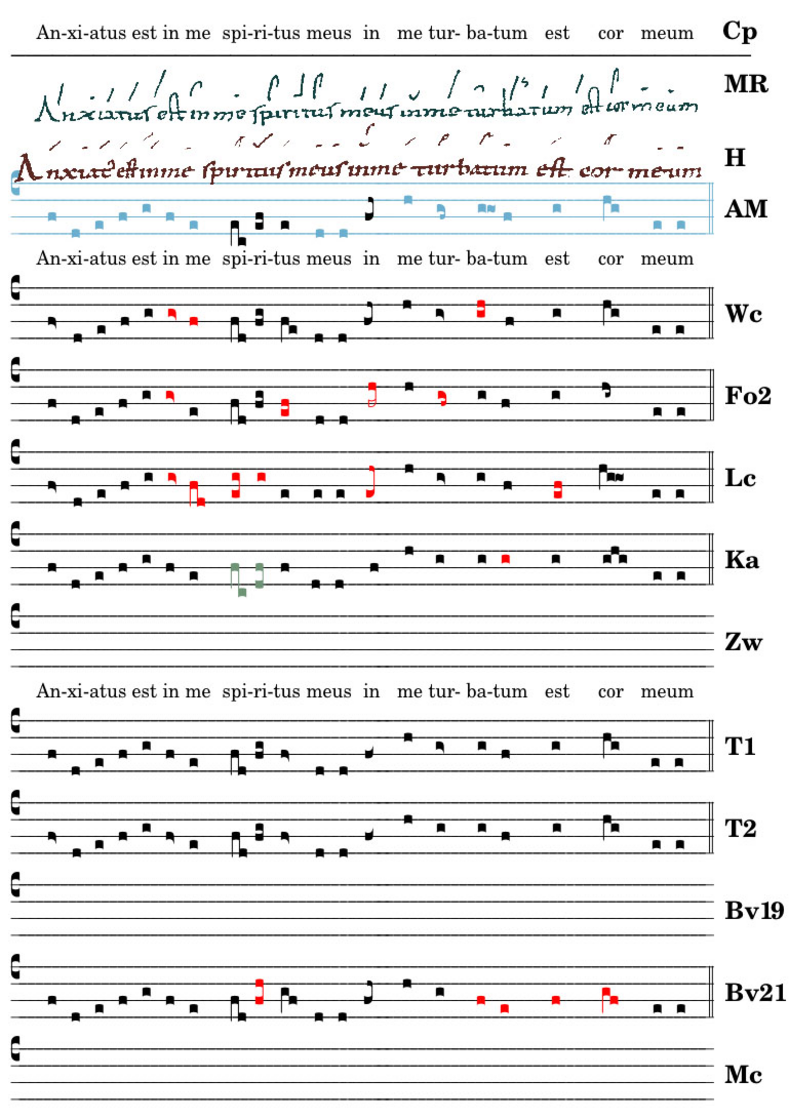 1BIN triv die Liqueszenzen löschen die überflüssigen Töne aus der Normalform (exemplum 0016) des Cento weg, zeigen dem Sänger an, welche Töne nicht nur weniger, sonder gar nicht zu singen sind. Selbst ein klanglicher Mehrwert des übriggebliebenen Tons muss muss in Frage gestellt werden, wenn auch der Sänger die Normalform mitdenkt. Durch die Liqueszenzzeichen weiß er, welche Töne er auszulassen hat.