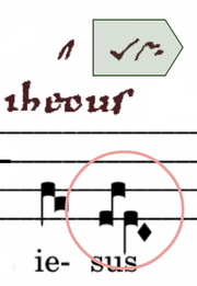 Nicht ganz 30 Fälle im Kernrepertoire, über 70 gesamt. Dieser 4stufige (5tonige ?) Pes subpunctis kommt eher in längeren, erzählenden Antiphonen vor. Im Protus authenticus steht er auf den Tönen re-fa-re-re-do.