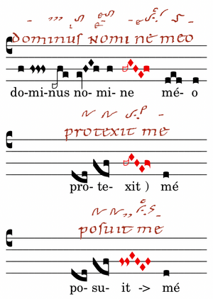 ClmR 3x Der ClmR ist die Neume, die, wie in der gesprochenen Sprache, die Melodie nach oben zieht, um den Hauptakzent am Schluss des Cento, und darum tief auf der Finalis, trotzdem als Hauptakzent erkennbar macht. Dreimal wird er in diesem IN eingesetzt: