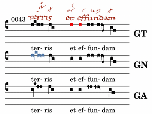 The treatment of the syllable ‘ter-ris’ in the GN is interesting. On the one hand, the initial articulation of the neume is taken into account, but on the other hand neither the do-revision is recognised (vide A+Y, Zt, Mod), nor is the “celeriter” above the Clv-graphy.