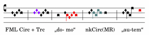 Die Logik der Neume „autem“ ist von der FML Circulatio her zu verstehen. Nicht selten wird die Circulatio im 3.Modus nach vorne hin erweitert (e.g.: IN 0116 fe-cisti, 0037 spi-ritum, 0042 al-le-luia), so auch in diesem IN bei „domo“. Ist die Circulatio nicht kurrent, wie fast immer in MR, so springt sie nach dem Tiefpunkt auf. Da bei „autem“ aber Rezitationj „si“ folgt, muss der Aufsprung zum „so“ führen. Damit ist der Oriscus applicatus hier ein Oriscus superans, er zieht den Ton zum Ténor „do“.