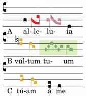 C The falling line “fa-mi-re” is enriched with FML PeCl, and “á me” has an accent pes. A Here the falling line “alleluia” is 'brushed against the grain', so to speak, with two porrectus. The “alleluia” is not an ending! B The cadence mega on “fa”, on the other hand, is a close, in modern terms, in the parallel major key, a semi-close to the introit, so to speak.