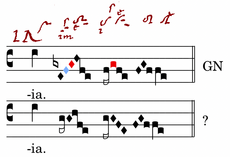 The Repetenda repeats the play that is foreign to the mode. The kPes before the VStr on “re” is noteworthy. It is an indication that the VStr is not a Pes (and certainly not a semitone Pes), because it anticipates the Pes movement. In the Jubilus, the Epiphonus prevents the second tone of this Pes.