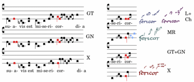 „quia su-a-vis“ Die VStr ist in allen adiastemmatischen Quellen als Ton+Oriscus notiert, in allen diastematischen Quellen ist die Silbe nur ein Ton. Sie fixiert hier den Ténor, die 'Hauptstrukturstufe der Deuteruskomposition zur Quart'; ebenso beim zweiten „miseri-cor-dia“.