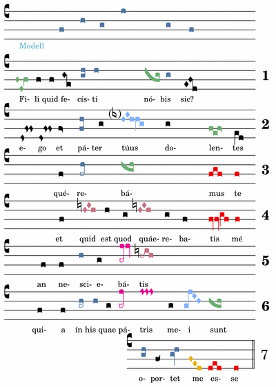 1 Fili quid fecisti nobis sic ' The kPrr de-accentuates the word „Fili“, both (following) accents lead only to „la“, the second accent „nóbis“ is also de-accented byPrr. The kTrc „mi-fa-re“ forms the question mark.