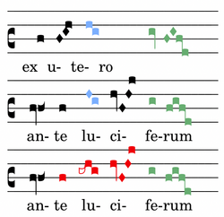 L, Ch und E hingegen unterdrücken den TrcPAR, der mit der folgenden Dreiklangsbewegung „fa-la-do“ zusammen eine zu starke Betonung auf „lucíferum“ legen würde, Hauptaussage bleibt „génui te“. Dessen ungeachtet bleibt der akzentvorbereitende Trc latent.