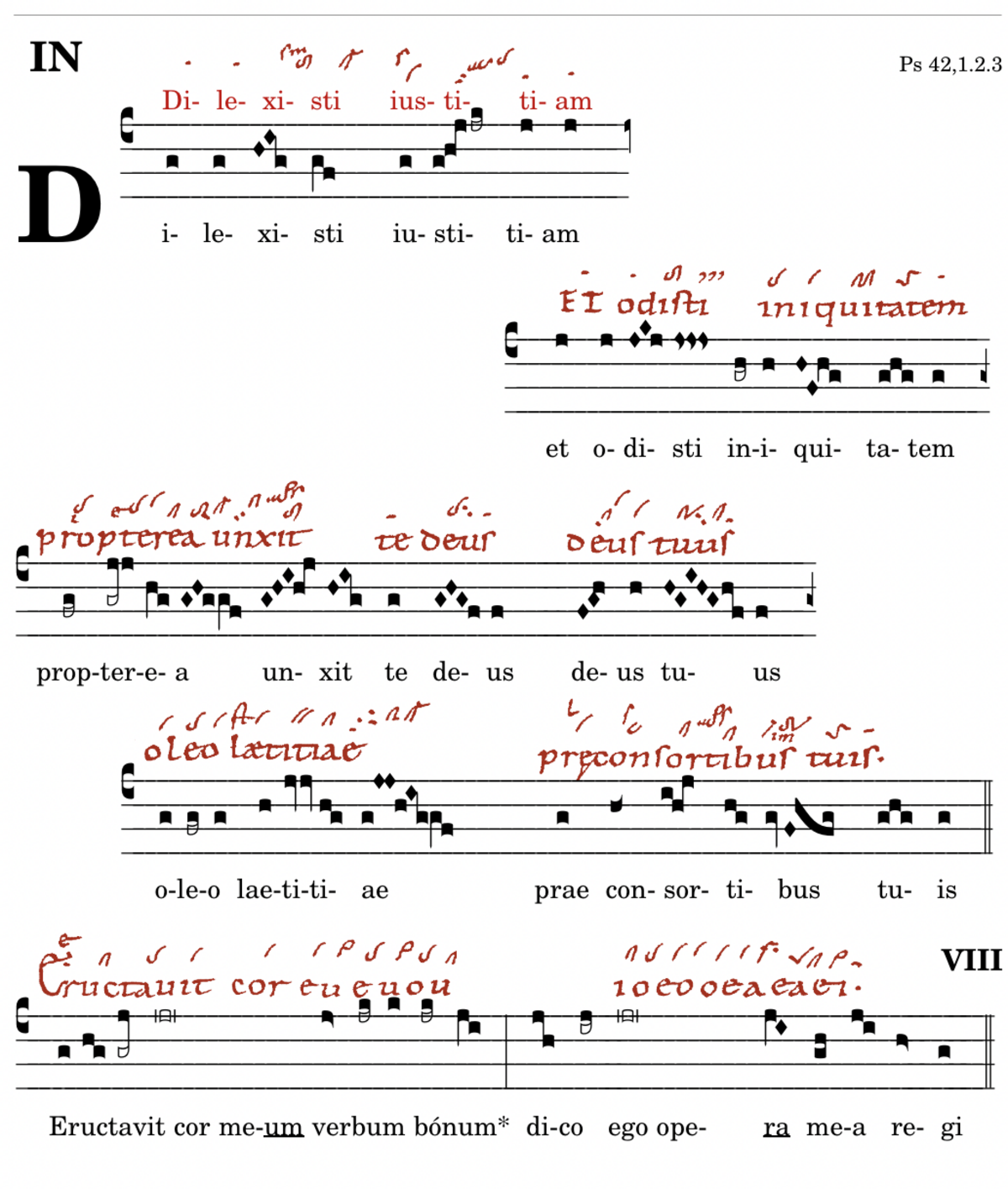Dilexisti iustitiam / et odisti iniquitatem / propterea unxit te deus . deus tuus / oleo laetitiae . prae consortibus tuis.