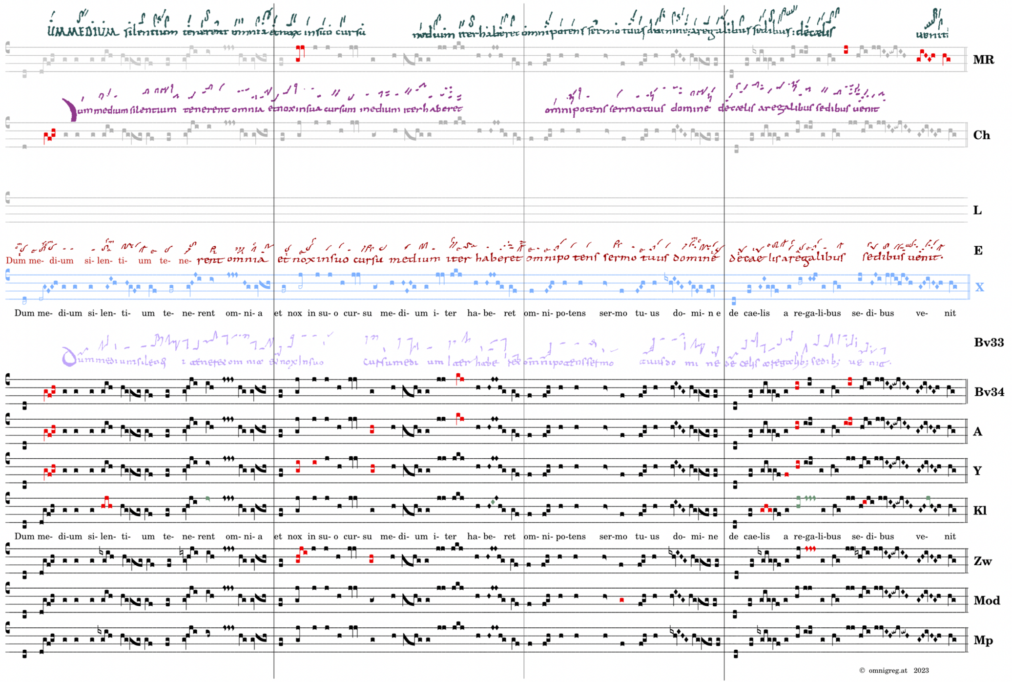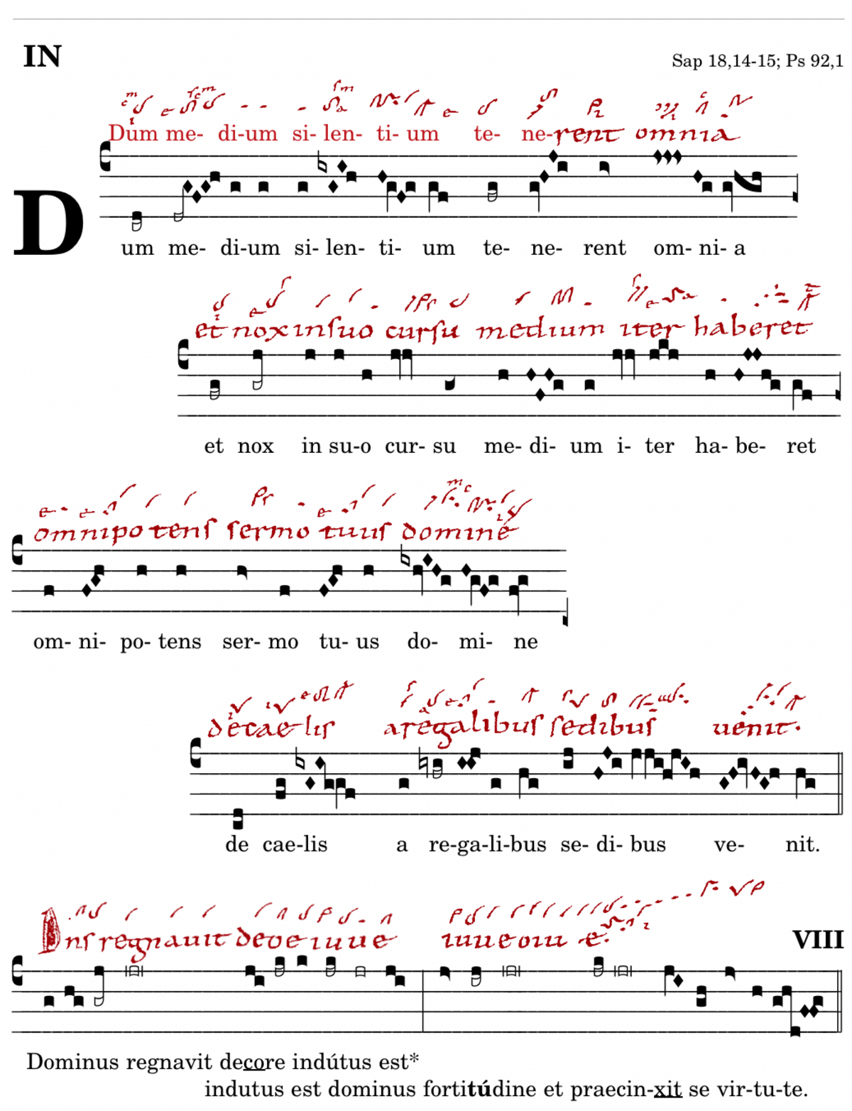 Dum medium silentium / tenerent omnia / et nox in suo cursu medium iter haberet / omnipotens sermo / tuus domine / de caelis a regalibus sedibus venit.