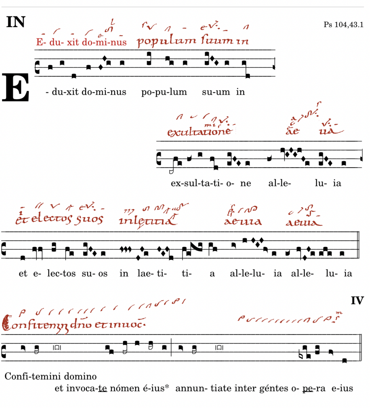 Eduxit dominus populum suum / in exsultatione / alleluia / et electos suos in laetitia / alleluia alleluia.
