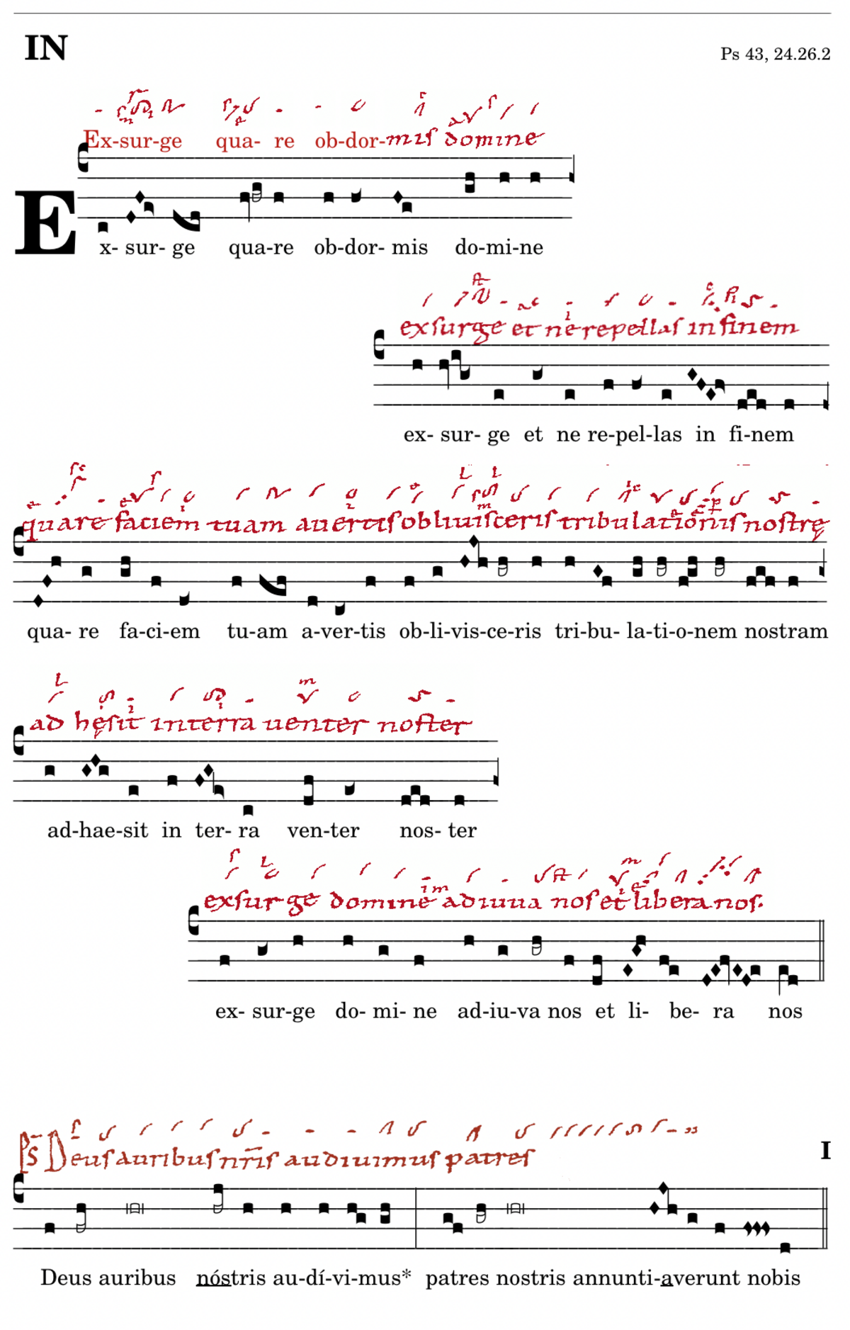 Exsurge quare obdormis domine / exsurge et ne repellas infinem / quare faciem tuam avertis / oblivisceris tribulationis nostrae / adhaesit in terra venter noster / exsurge domine adiuva nos / et libera nos.