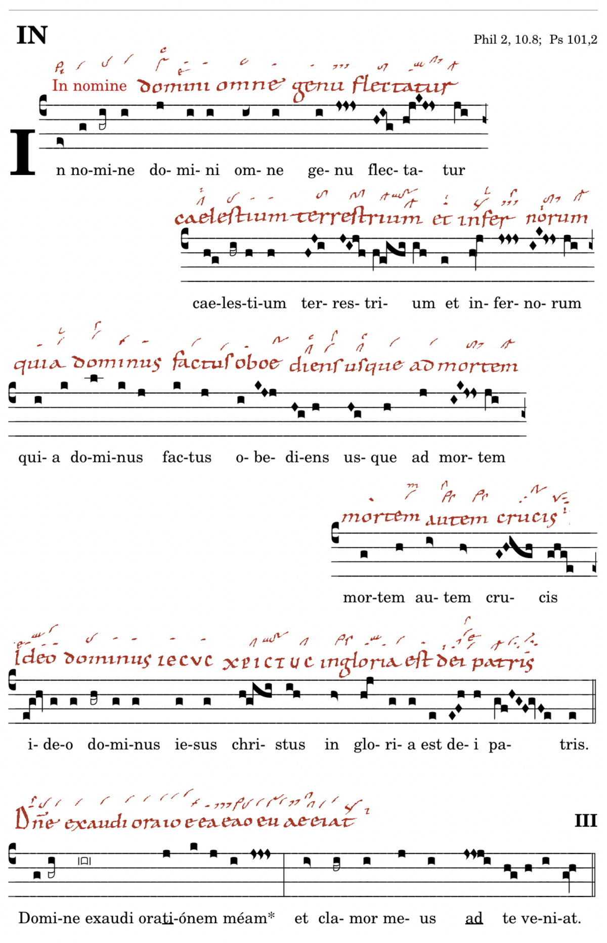 In nomine domini / omne genu flectatur / caelestium terrestrium et infernorum . quia dominus factus oboediens / usque ad mortem . mortem autem crucis / ideo dominus iesus christus / in gloria est dei patris.