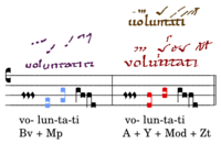 Bv + Mp sind für die „mi“-Lösung, A / Y + Mod + Zt für „fa“. neben Bv und A/Y sind die begleitenden diastemtischen Quellen sehr vorsichtig zu werten. Jedes Argument pro kann durch ein contra aufgewogen werden. Bleiben die adiatematischen Zeugen: L ist nicht zu deuten, aber Ch ist wohl ein Zeuge für Bv. Dagegen ist E mit inferius und sursum eindeutig. Der Pes disgregatus in Bam unterstützt diese Lesart. Da wir uns im Zweifelsfall grundsätzlich für St.Gallen entscheiden ist unsere Lösung „re-fa- fa-sol“.