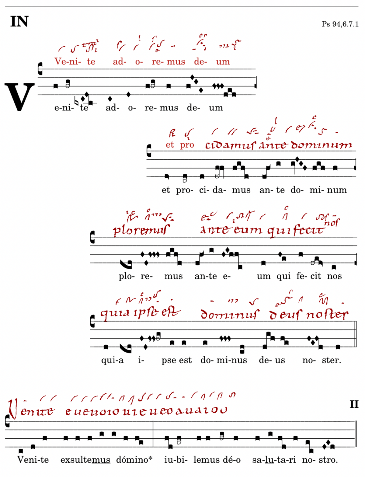 Venite adoremus deum / et procidamus ante dominum / ploremus ante eum qui fecit nos / quia ipse est dominus deus noster.