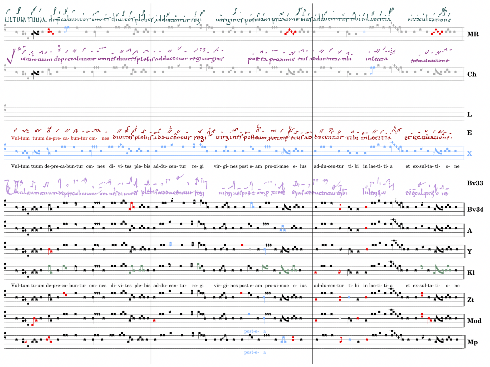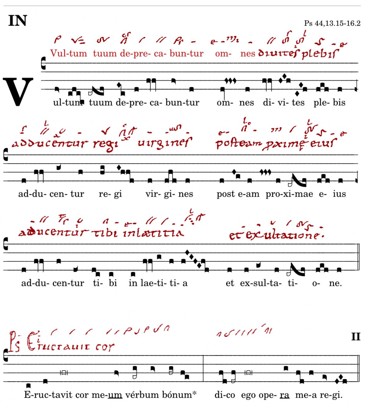 Vultum tuum deprecabuntur / omnes divites plebis / adducentur regi virgines post eam / proximae eius / adducentur tibi / in laetitia et exsultatione.