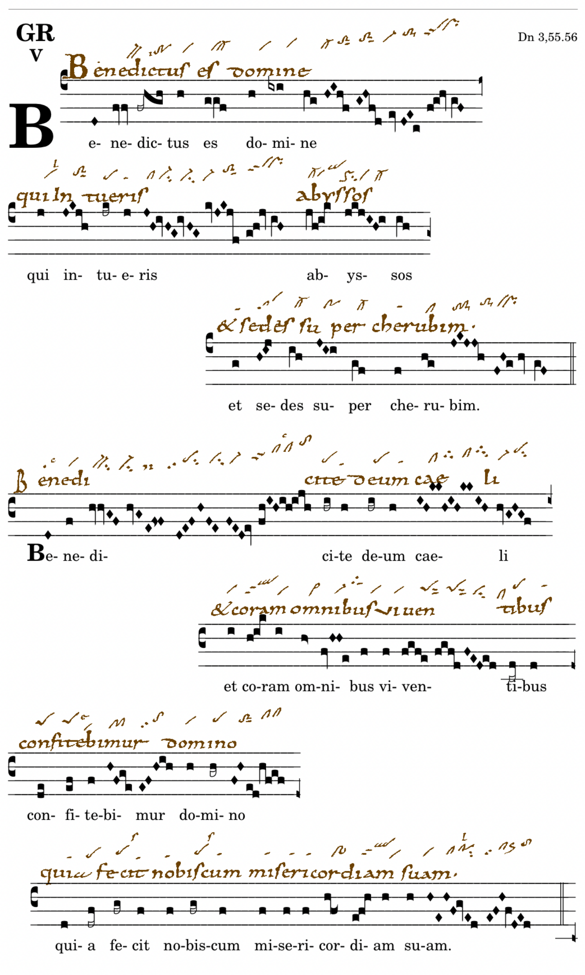 Benedictus es domine / qui intueris abyssos * et sedes super / cherubim. V. Benedictus es / domine in firmamento caeli * et laudabilis in saecula.