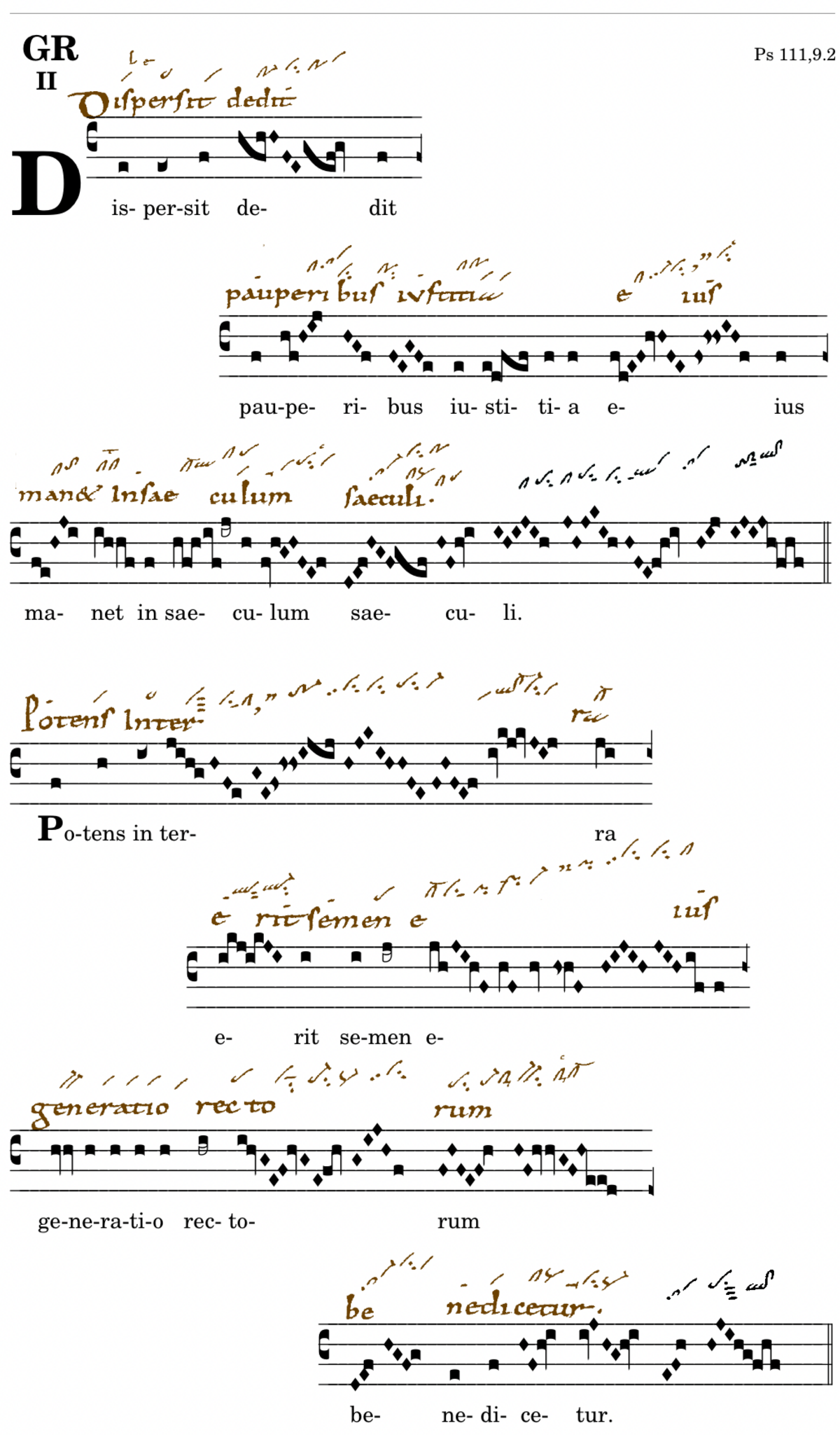 Dispersit dedit / pauperibus iustitia eius * manet in saeculum / saeculi. V. Potens in terra / erit semen eius * generatio rectorum / benedicetur.