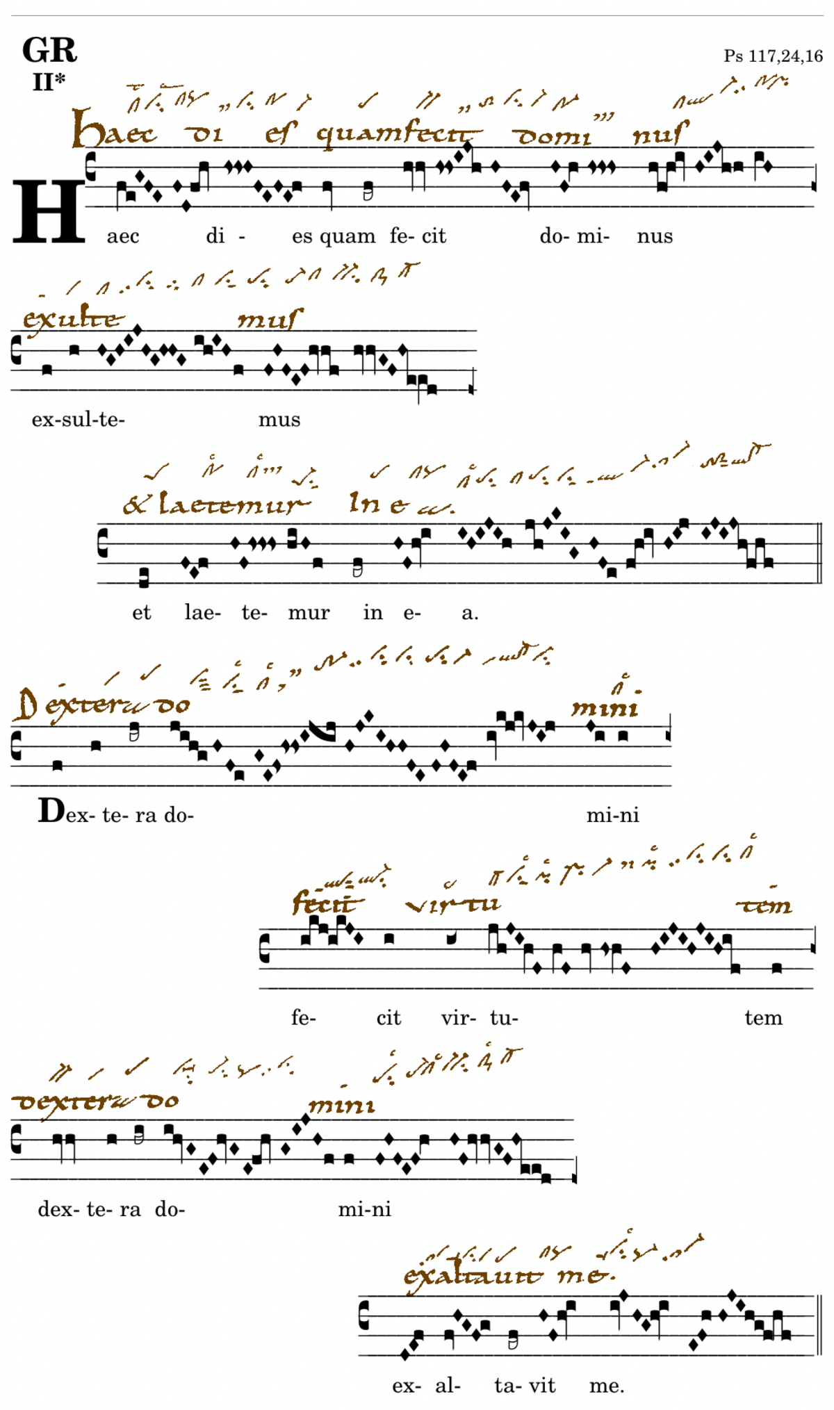 Haec dies / quam fecit dominus * exsultemus / et laetemur in ea. V. Dextera domini / fecit virtutem * dextera domini / exaltavit me.
