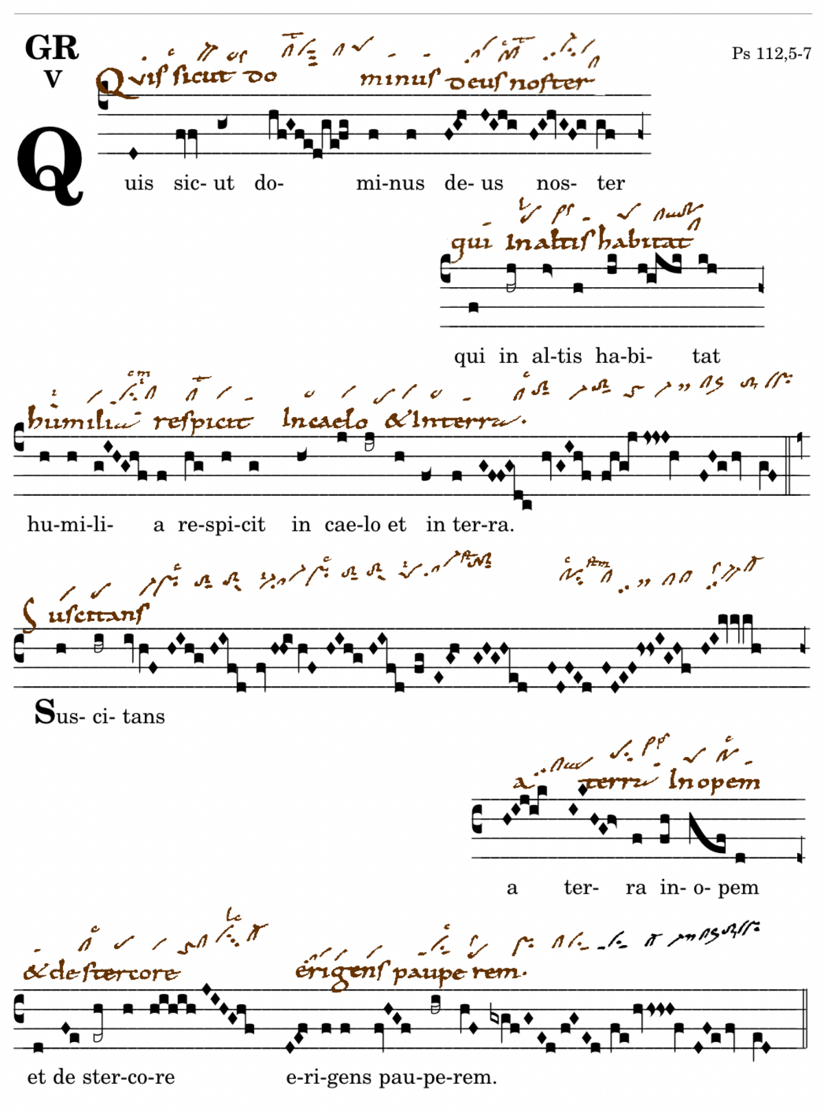 Quis sicut dominus deus noster / qui in altis habitat * humilia respicit in caelo et in terra. V. Suscitans a terra inopem * et de stercore erigens pauperem.