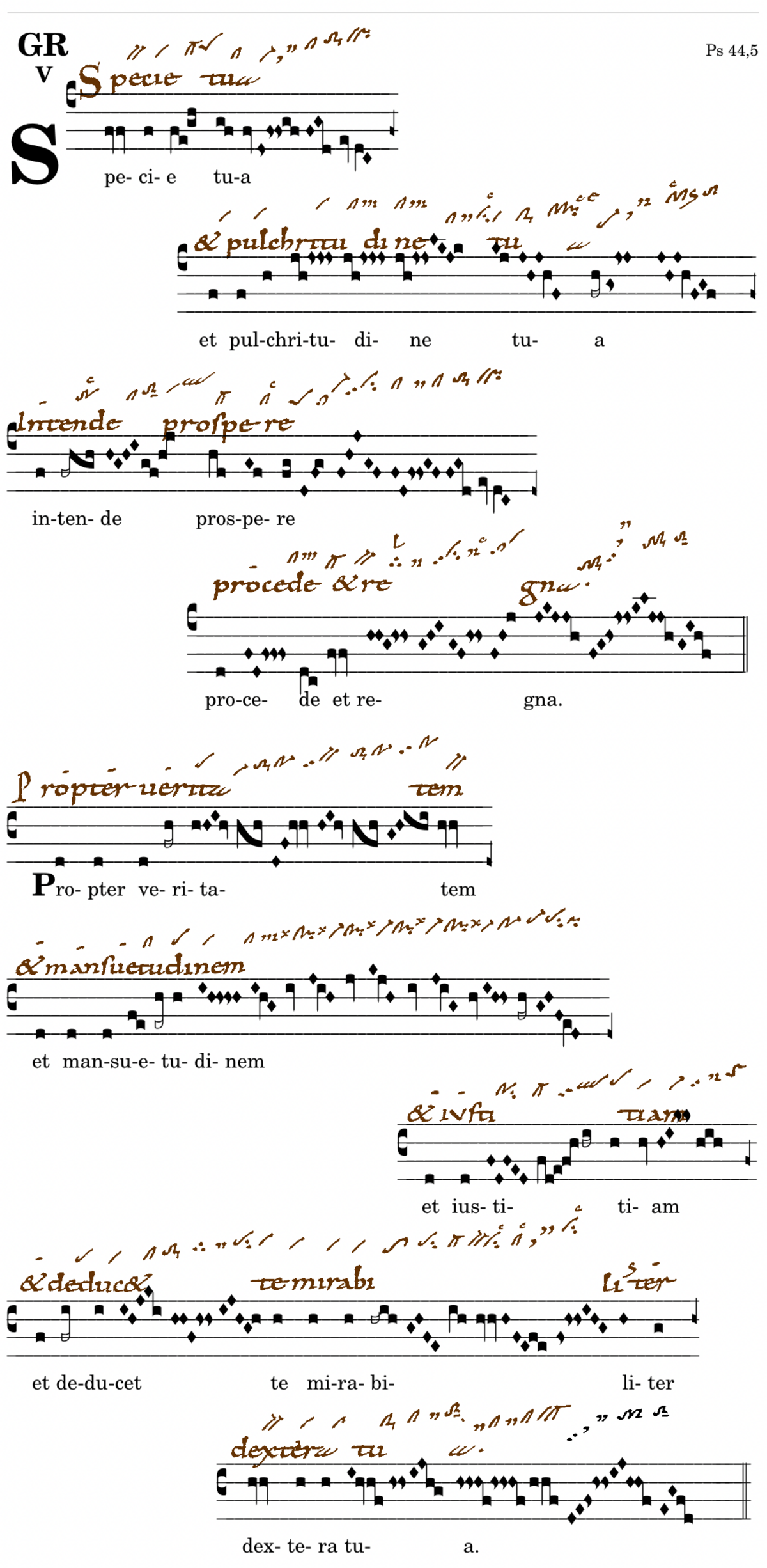 Specie tua / et pulchritudine tua * intende prospere / procede et regna. V. Propter veritatem . et mansuetudinem / et iustitiam * et deducet te mirabiliter / dextera tua.
