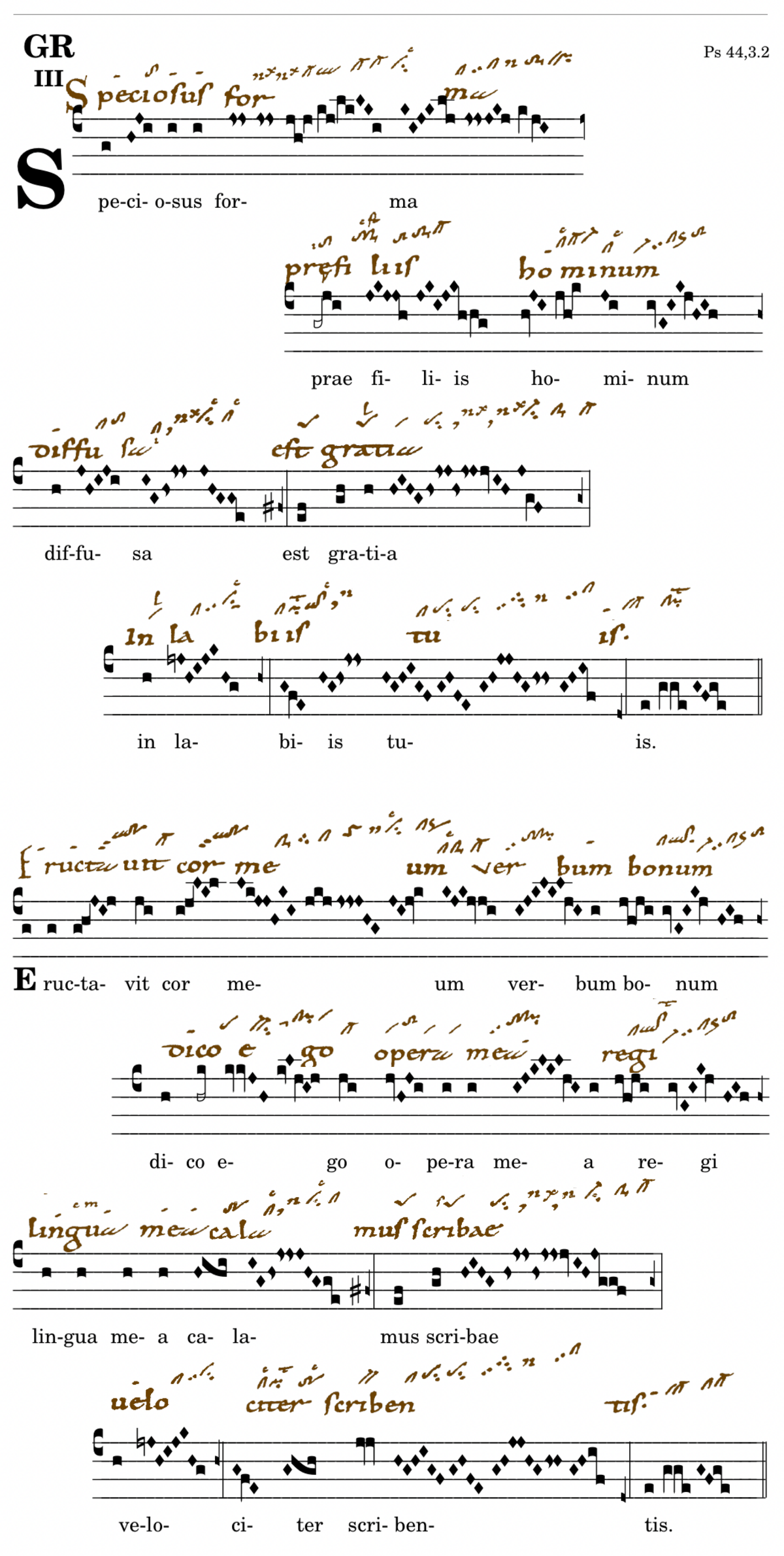 Speciosus forma / prae filiis hominum * diffusa est gratia / in labiis tuis.