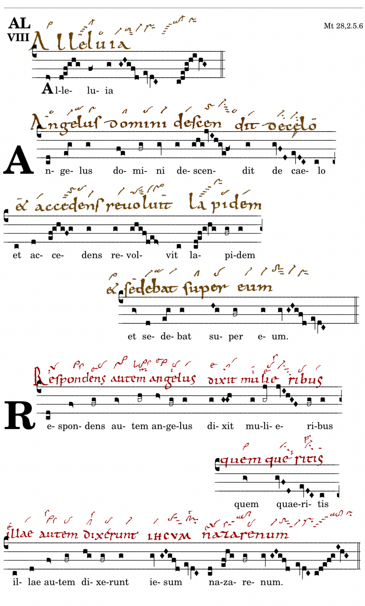 V1. Angelus domini / descendit de caelo * et accedens revolvit lapidem / et sedebat super eum. V2. Respondens autem angelus dixit mulieribus / quem quaeritis * illae autem dixerunt / iesum nazarenum.