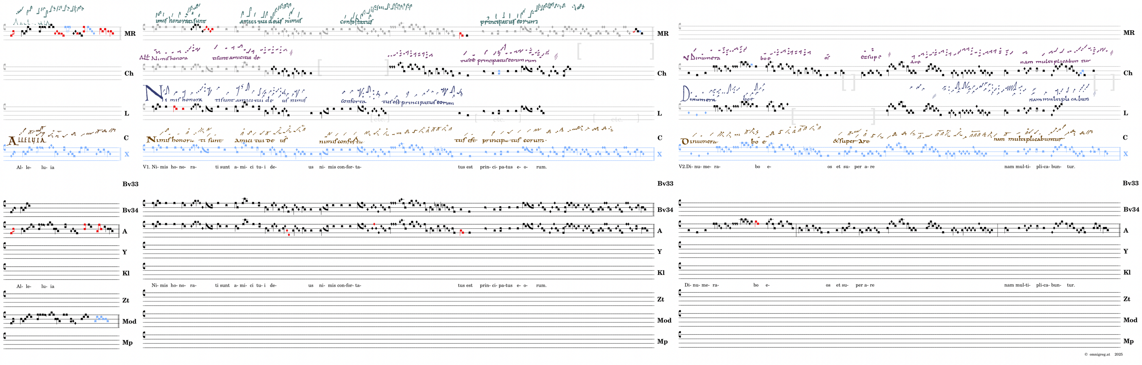 V1. Nimis honorati sunt / amici tui deus * nimis confortatus est / principatus eorum. V2. Dinumerabo eos * et super arenam / multiplicabuntur.