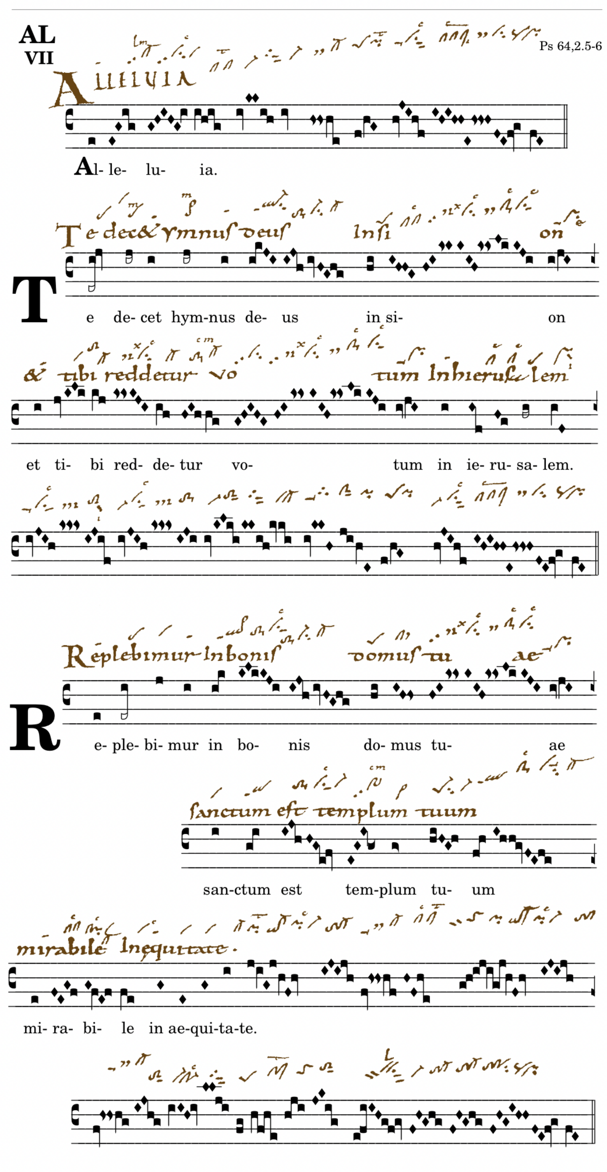 V1. Te decet hymnus deus / in sion * et tibi reddetur votum / in ierusalem. V2. Replebimur in bonis / domus tuae * sanctum est templum tuum / mirabile in aequitate.