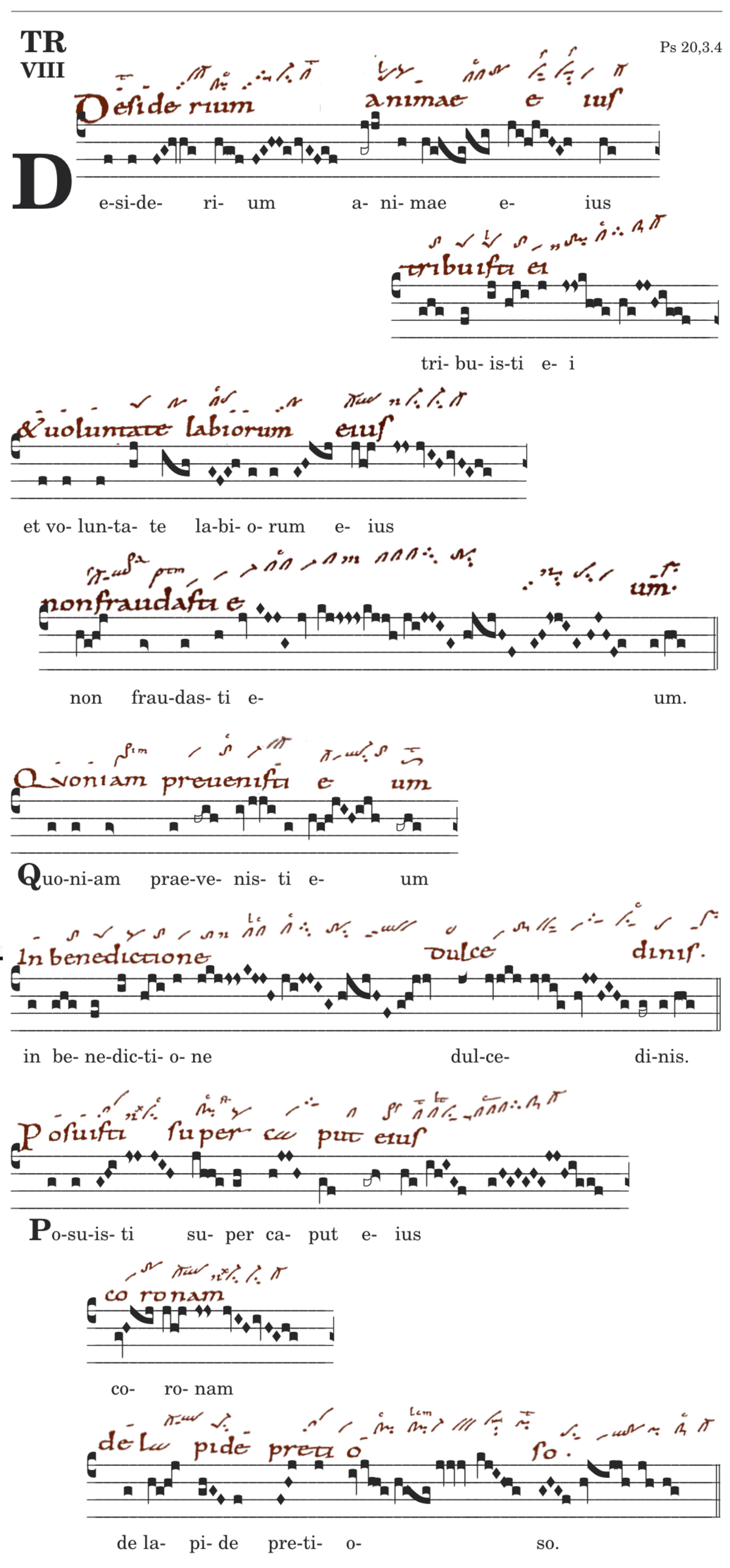 V1. Desiderium animae eius tribuisti ei* et voluntate labiorum eius non fraudasti eum. V2. Quoniam praevenisti eum* in benedictione dulcedinis. V3. Posuisti super caput eius * coronam de lapide pretioso.
