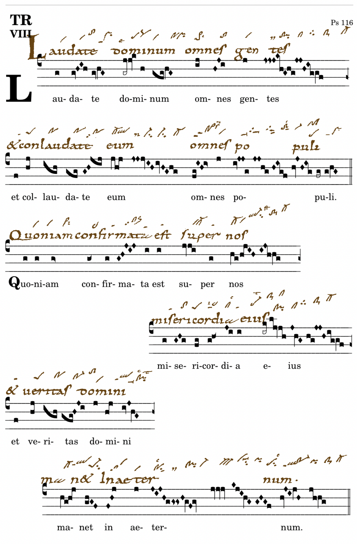 V1. Laudate dominum omnes gentes * et collaudate eum omnes populi. V2. Quoniam confirmata est super nos / misericordia eius et veritas / domini manet in aeternum.