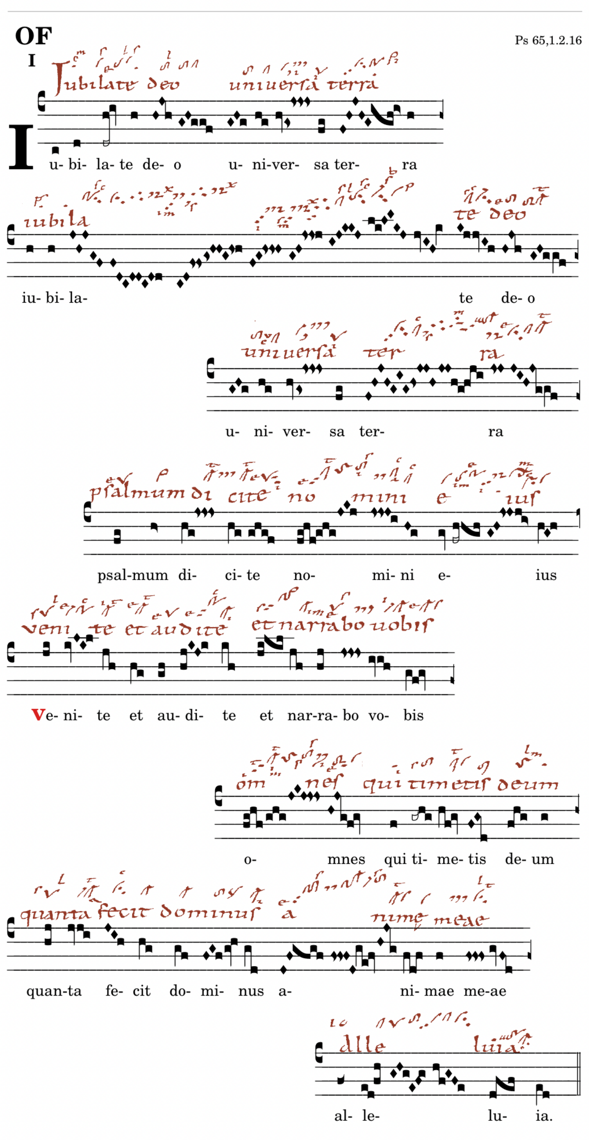 Iubilate deo universa terra / iubilate deo universa terra / psalmum dicite nomini eius / 📍venite et audite et narrabo vobis / omnes qui timetis deum / quanta fecit dominus animae meae / alleluia.
