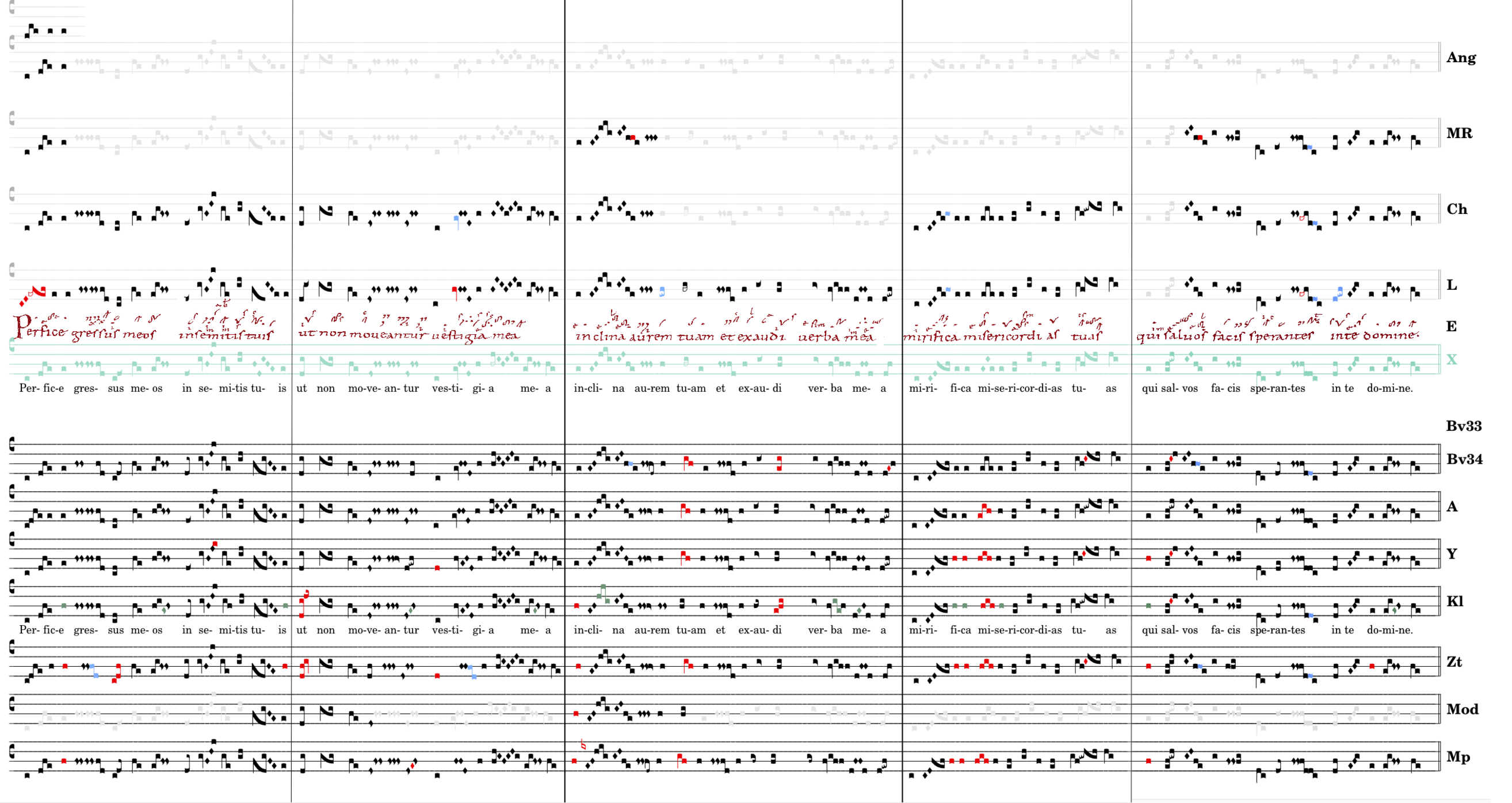 „ex-au-di“ „fa“ oder „sol“? Für „fa“ spricht nur L und Kl, für „sol“ Bv, A, Y, Mp, wenn da nicht die Frage nach dem „zweiten Ton der Liqueszenz“ wäre. Der Hinweis auf R.Fischer (BzG 8, S5ff) verwirrt die Situation. Wenn Fischer auch darauf hinweist, dass Bv keinen kleinen Nebenton hat, so interpretiert GrN seine Aussagen doch so, dass hier ein Epiphonus „fa-sol, vorliegt, dem ein Cephalicus „sol-fa“ entspricht, E + L schreiben Epiphonus, also „fa“. Für uns hat im authentischen Choral keine Liqueszenz einen zweiten Ton. In E kann/muss das altius daher für den Ton selbst gelesen werden. das inferius am Beginn des folgenden Pes spricht in die selbe Richtung.