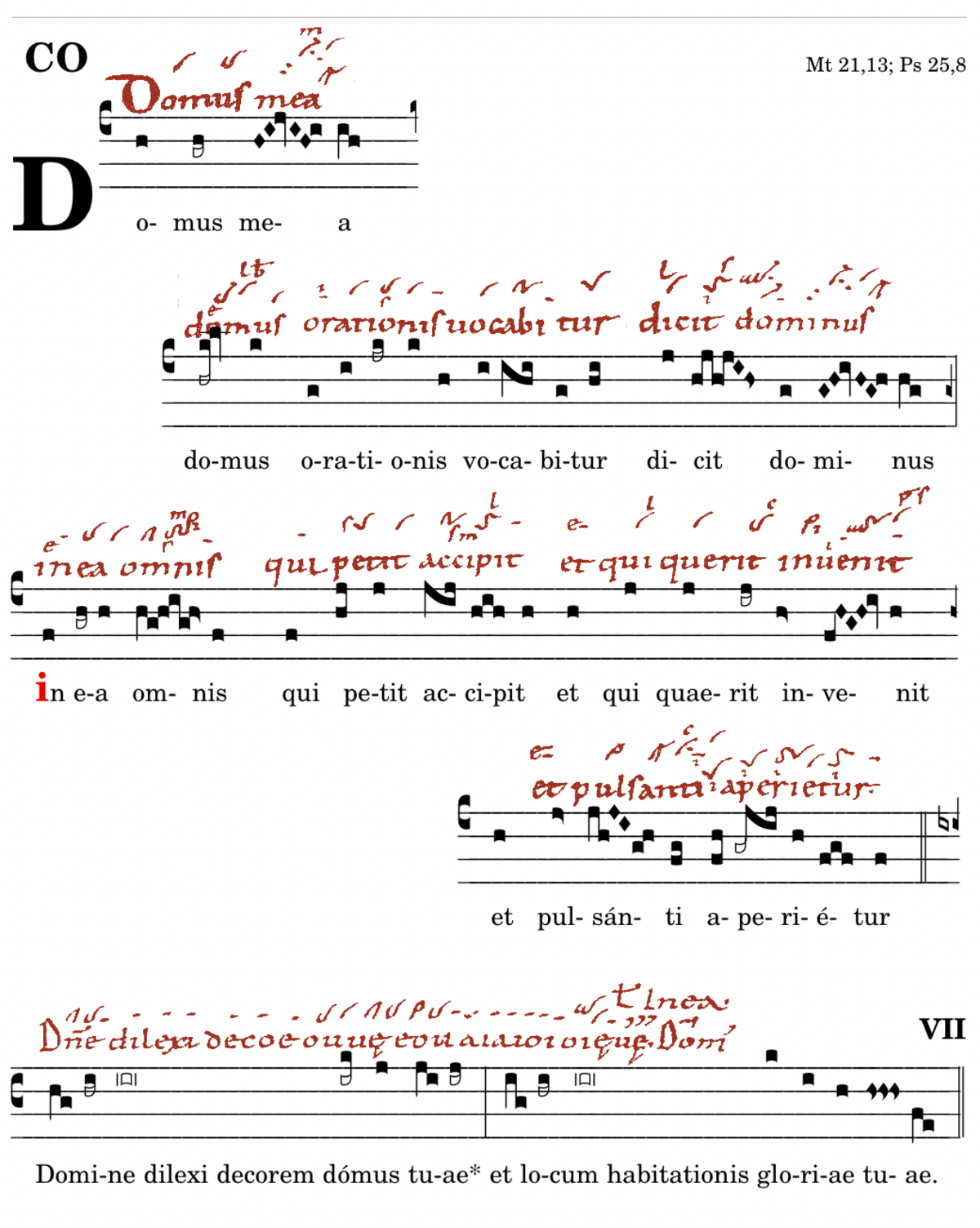 Domus mea / domus orationis vocabitur / dicit dominus / in ea omnis qui petit accipit / et qui quaerit invenit / et pulsanti aperietur.