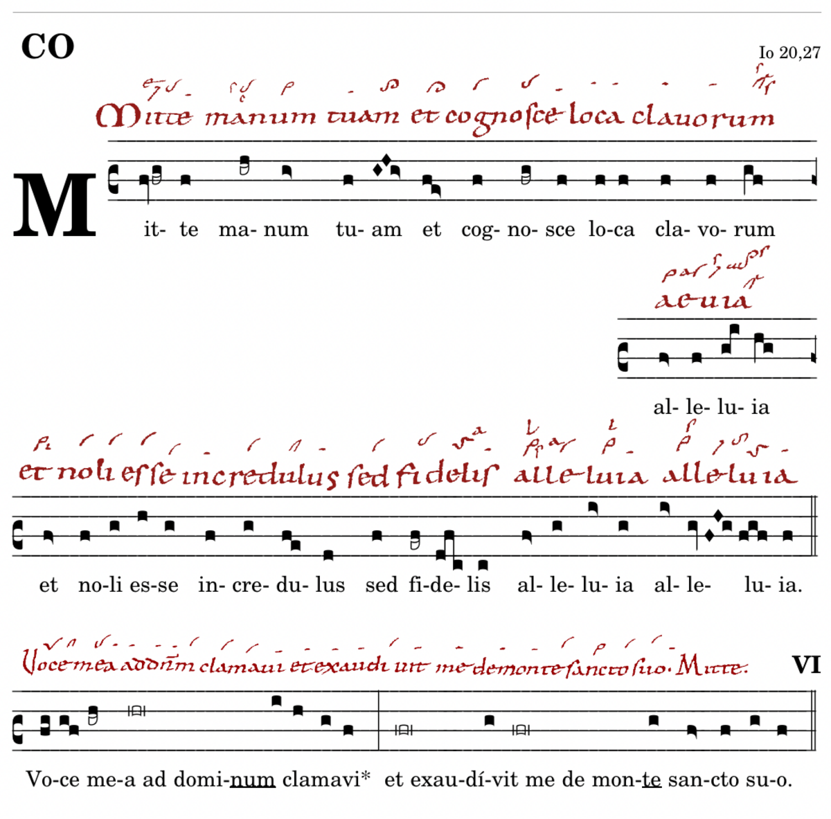 Mitte manum tuam / et cognosce loca clavorum / alleluia / et noli esse incredulus / sed fidelis / alleluia / alleluia.