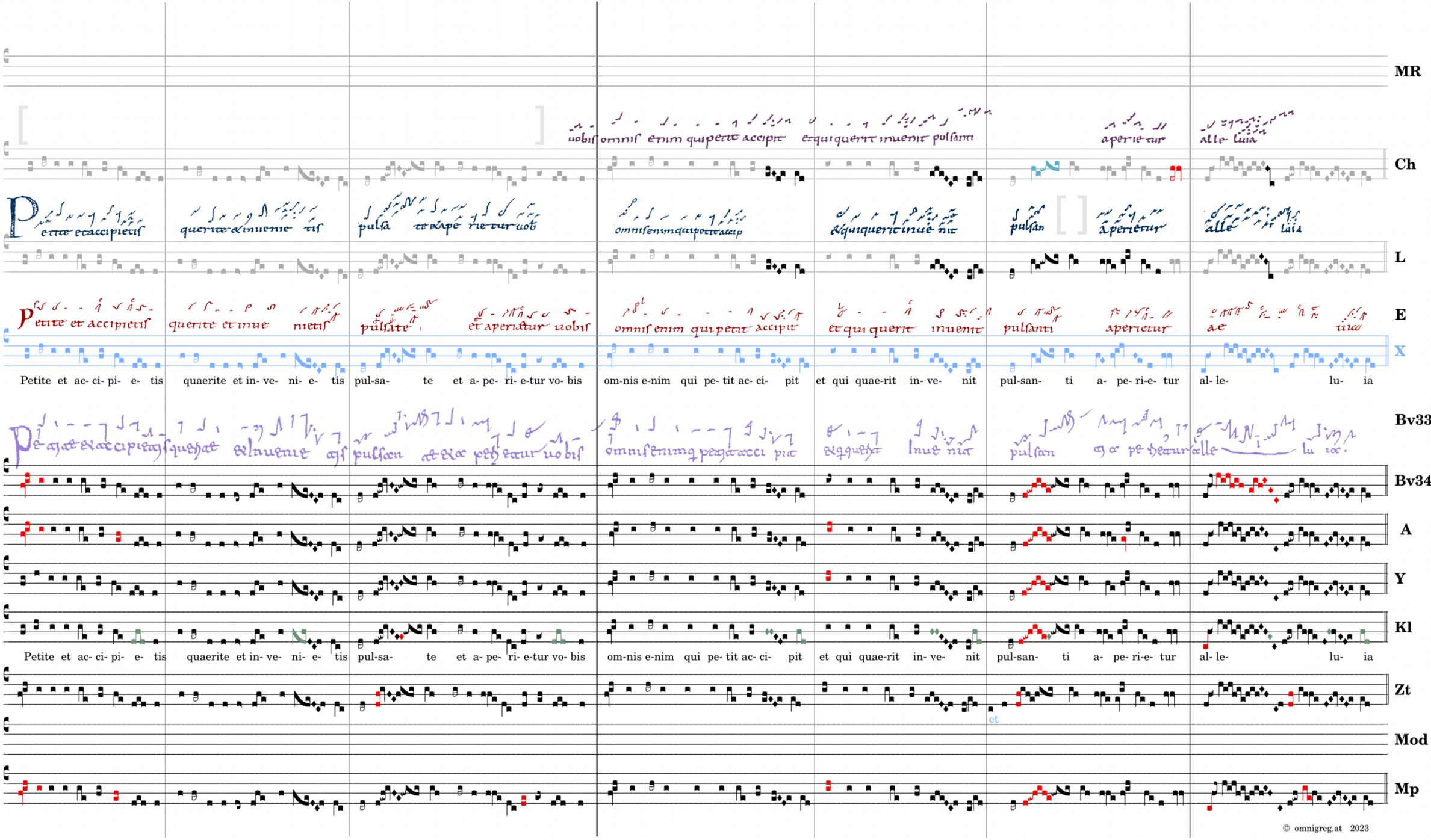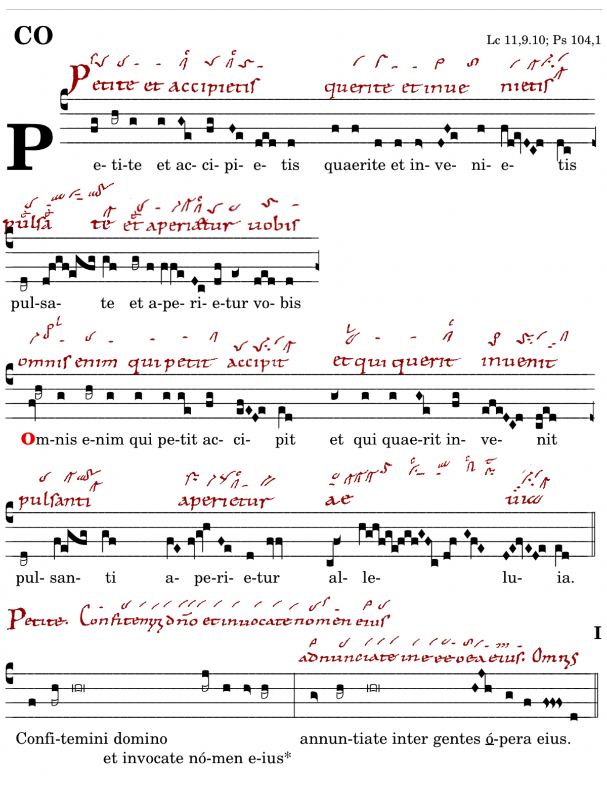 Petite et accipietis / quaerite et invenietis / pulsate et aperietur vobis / omnis enim qui petit accipit / et qui quaerit invenit / pulsanti aperietur / alleluia.