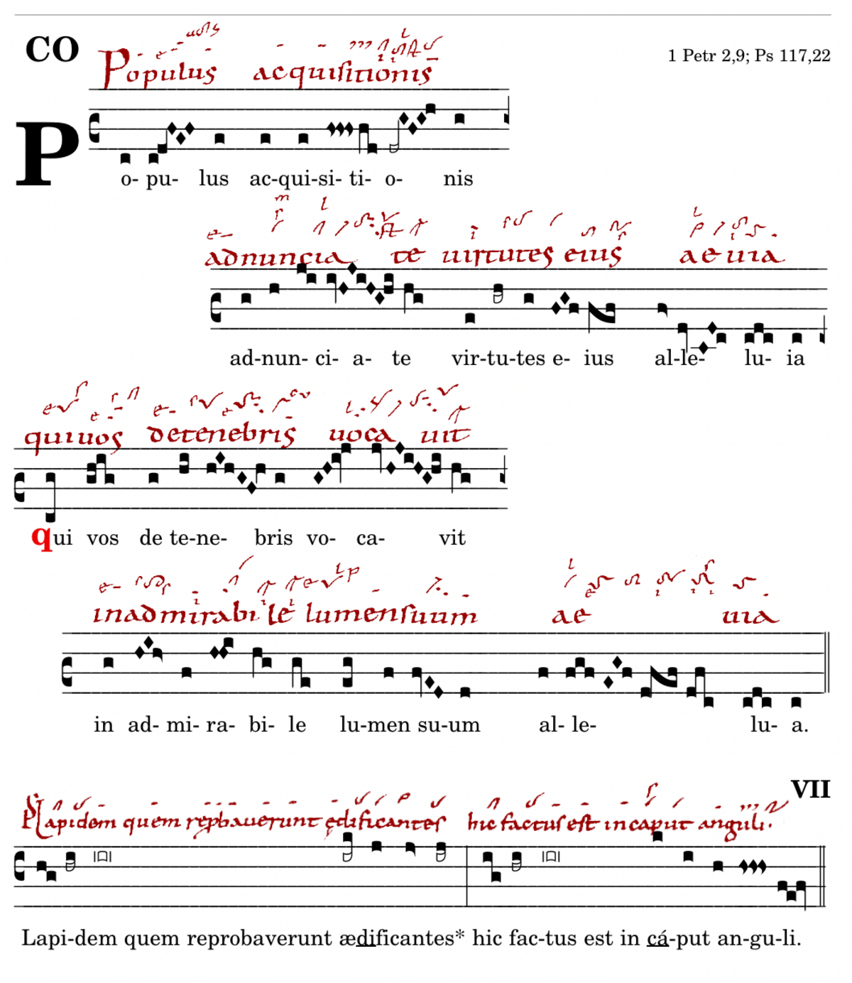 Populus acquisitionis / annuntiate / virtutes eius / alleluia / qui vos de tenebris / vocavit / in admirabile lumen suum / alleluia.