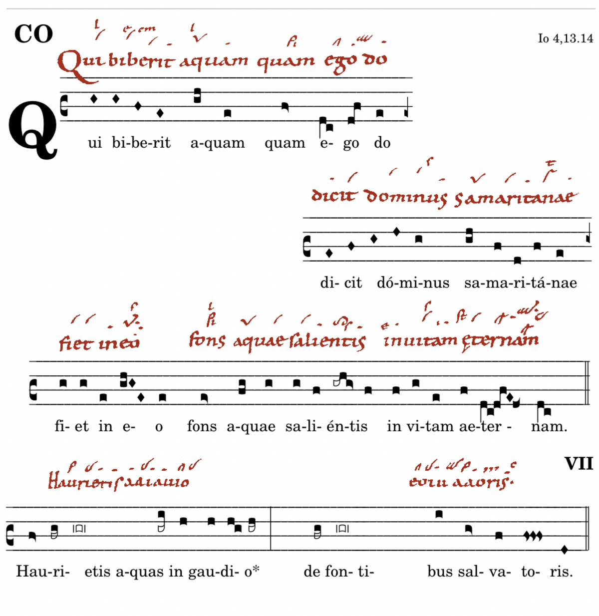 Qui biberit aquam quam ego do / dicit dominus samaritanae / fiet in eo / fons aquae salientis / in vitam aeternam.