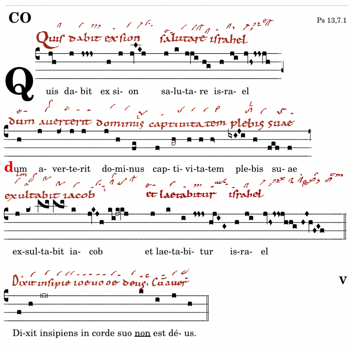 Quis dabit ex sion salutare israel / dum averterit dominus captivitatem plebis suae / exsultabit iacob / et laetabitur israel.