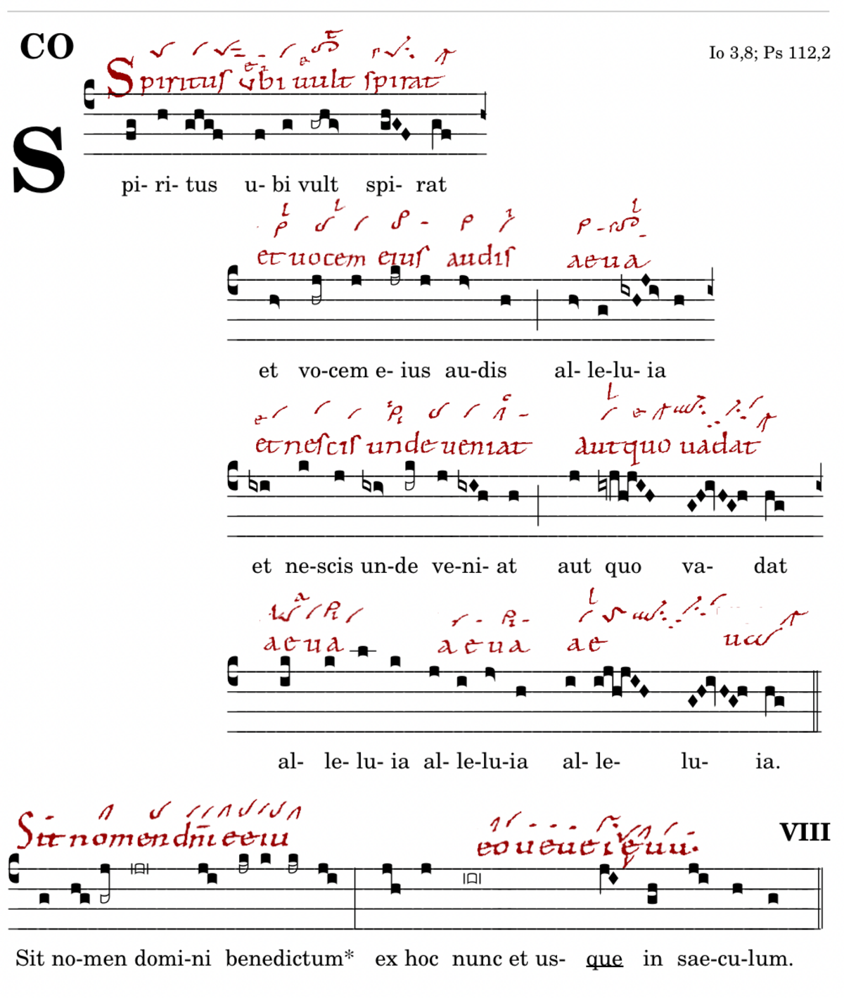 Spiritus ubi vult spirat / et vocem eius audis . alleluia / et nescis unde veniat . aut quo vadat / alleluia alleluia / alleluia.