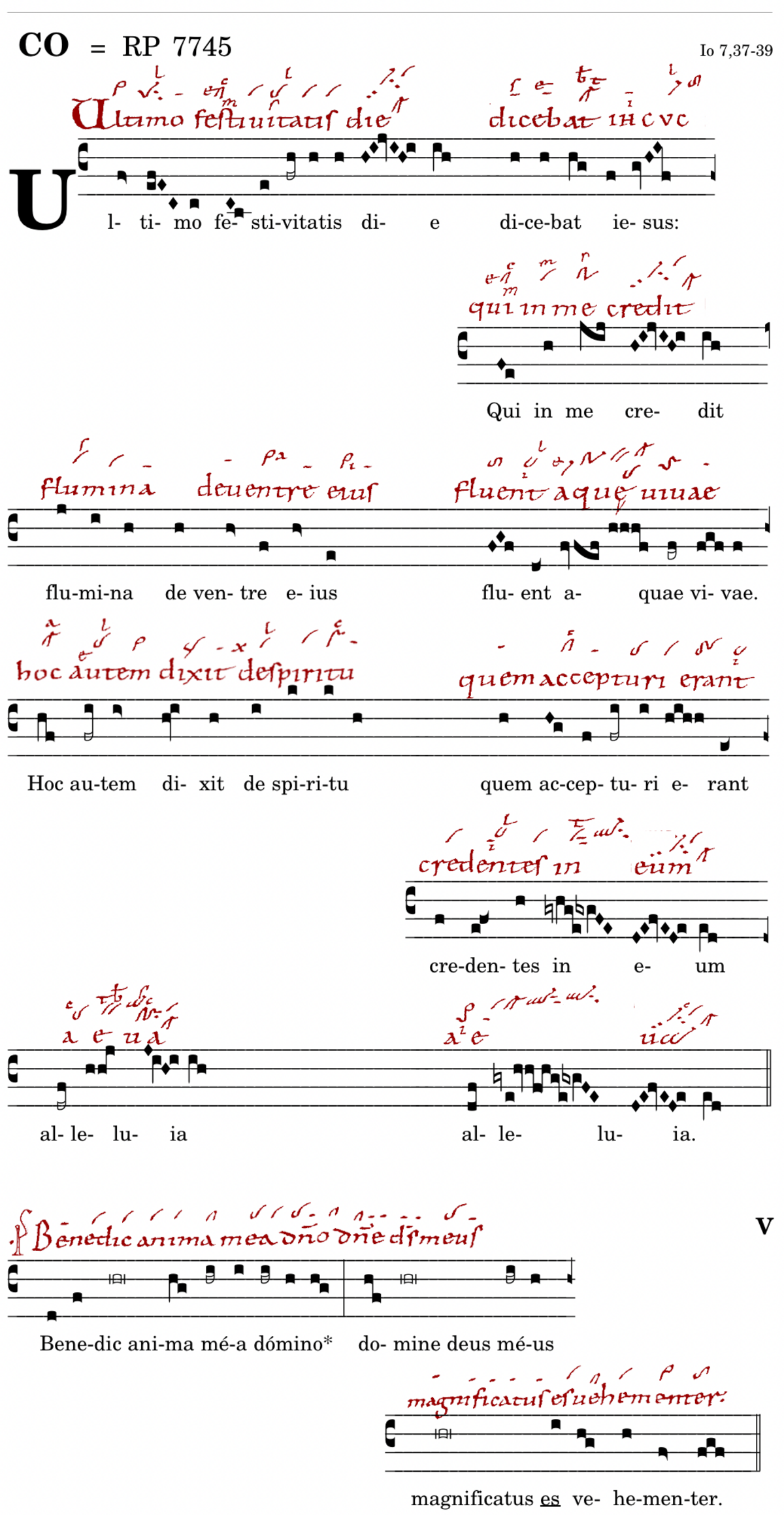 Ultimo festivitatis die / dicebat iesus / qui in me credit / flumina de ventre eius / fluent aquae vivae / hoc autem dixit / de spiritu quem accepturi erant / credentes in eum / alleluia alleluia.