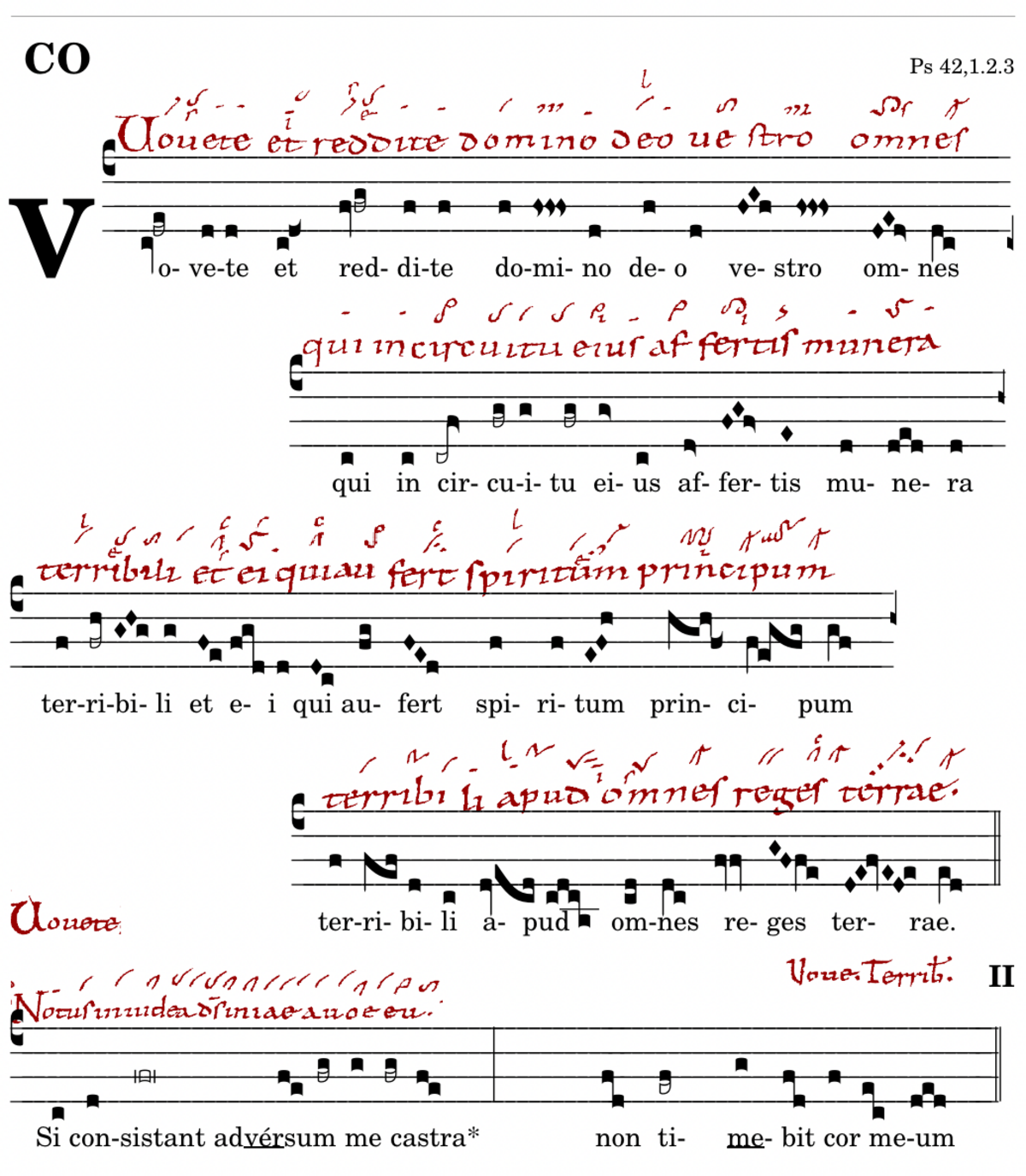Vovete et reddite domino deo vestro / omnes qui in circuitu eius affertis munera / terribili et ei qui aufert spiritum principum / terribili apud omnes reges terrae.