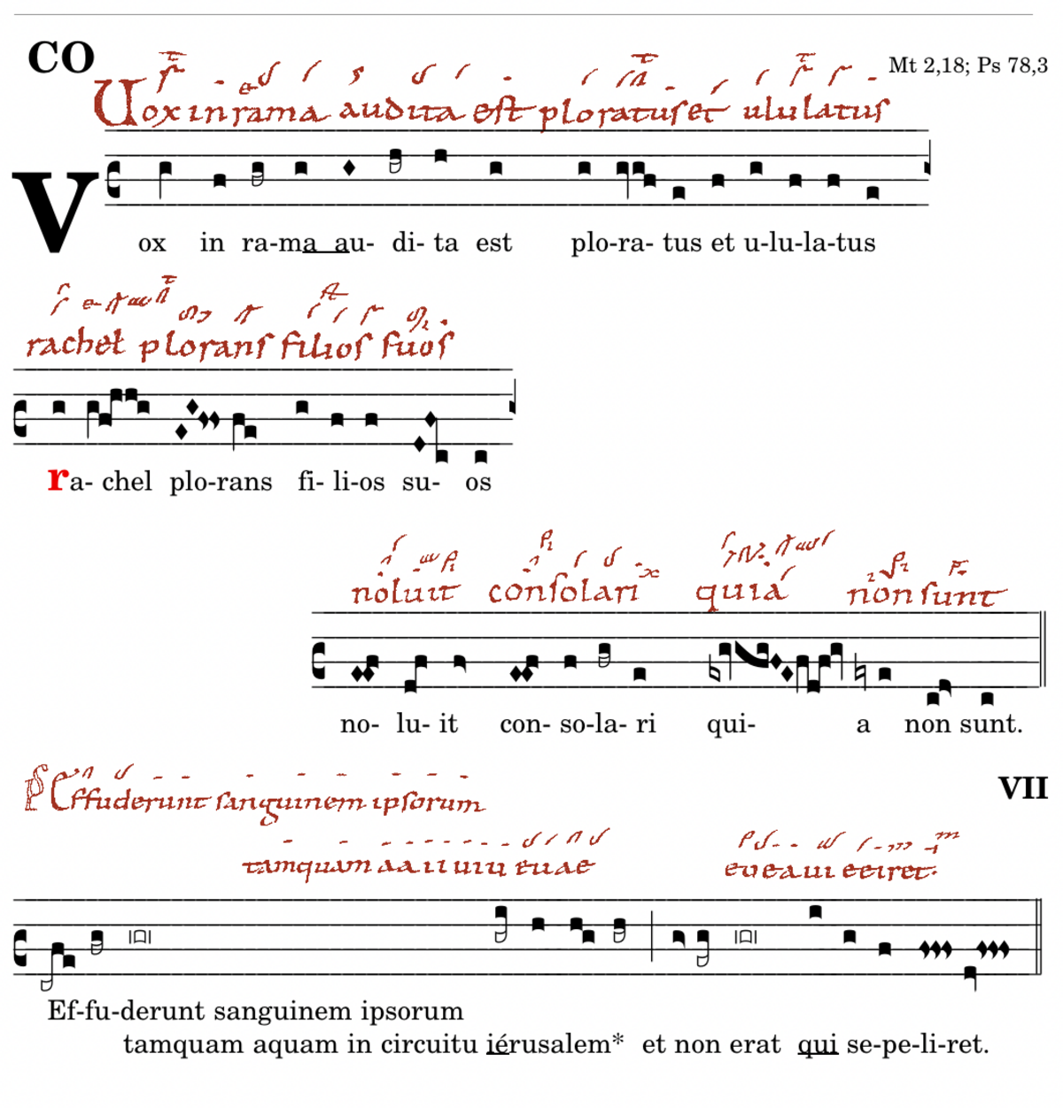 Vox in rama audita est / ploratus et ululatus / rachel plorans filios suos / noluit consolari / quia non sunt.