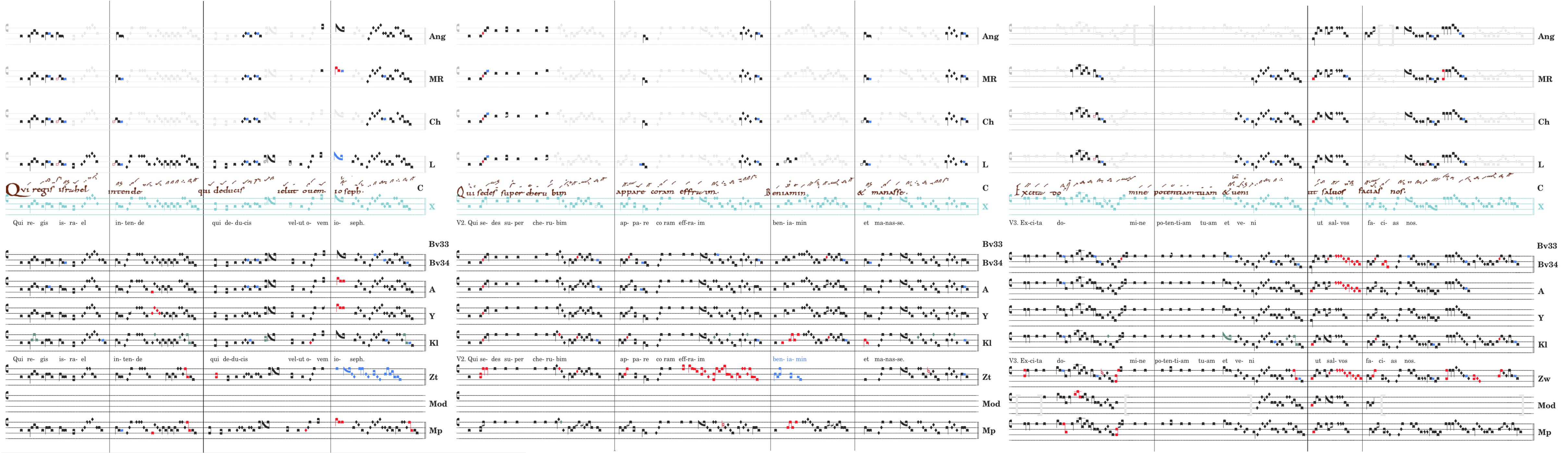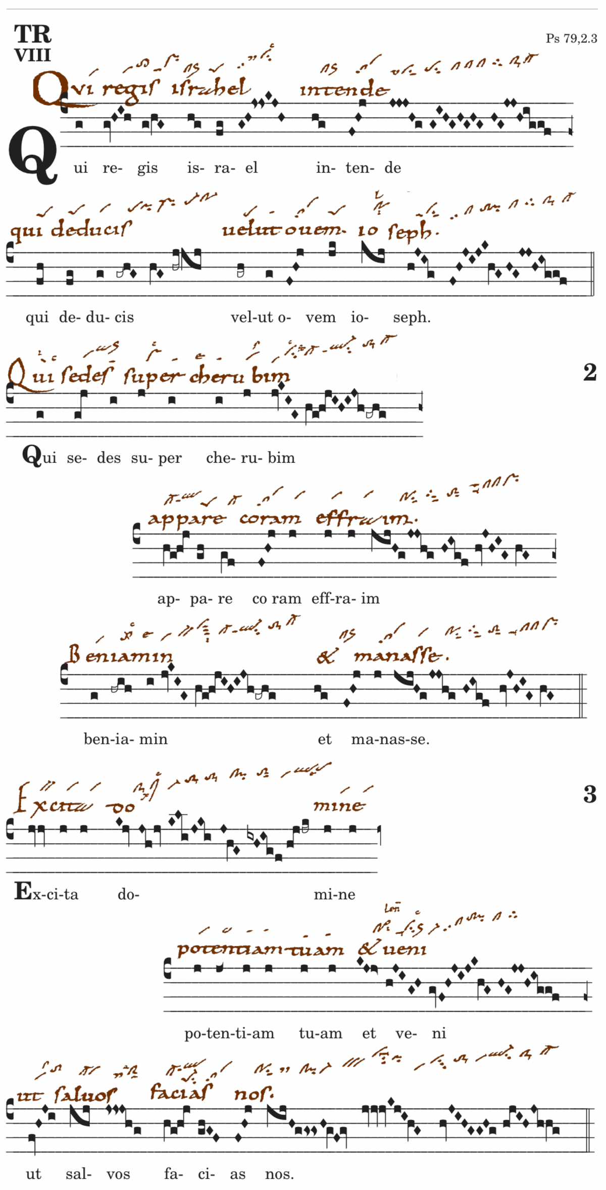 V1. Qui regis israel intende * qui deducis velut ovem ioseph. V2. Qui sedes super cherubim appare * coram effraim beniamin et manasse. V3. Excita domine potentiam tuam * et veni ut salvos facias nos.