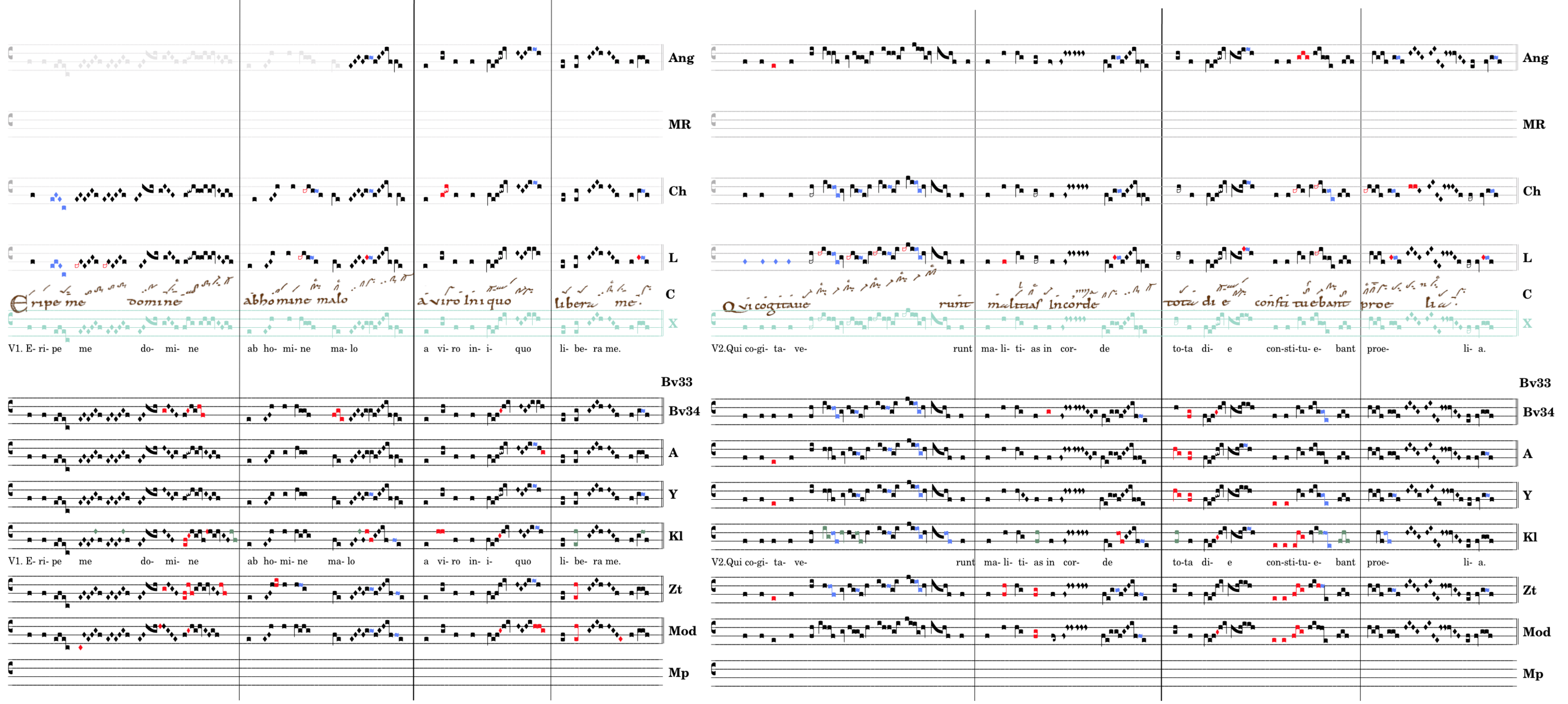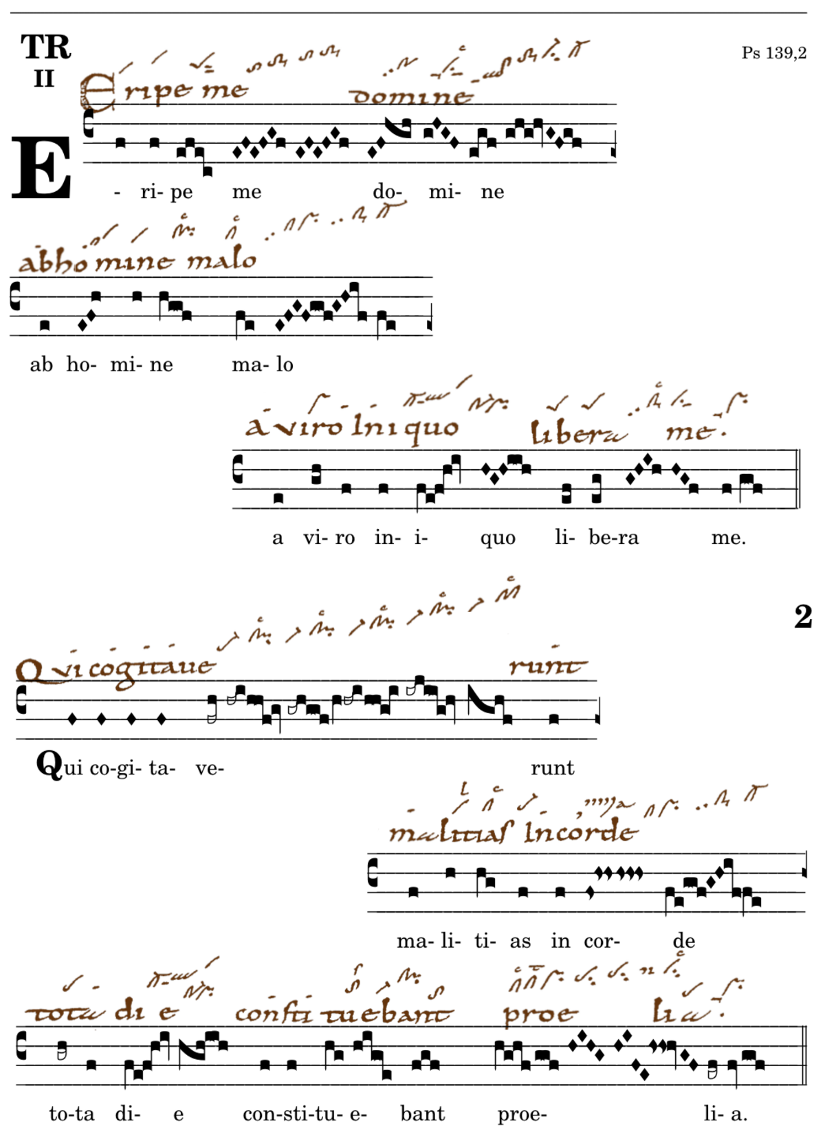 V1. Eripe me domine // ab homine malo * a viro iniquo / libera me. V2. Qui cogitaverunt / malitias in corde * tota die / constituebant proelia.