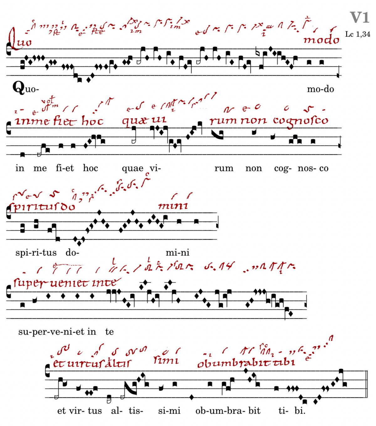 V1. Quomodo / in me fiet hoc / quae virum non cognosco / spiritus domini superveniet in te / et virtus altissimi obumbrabit tibi.