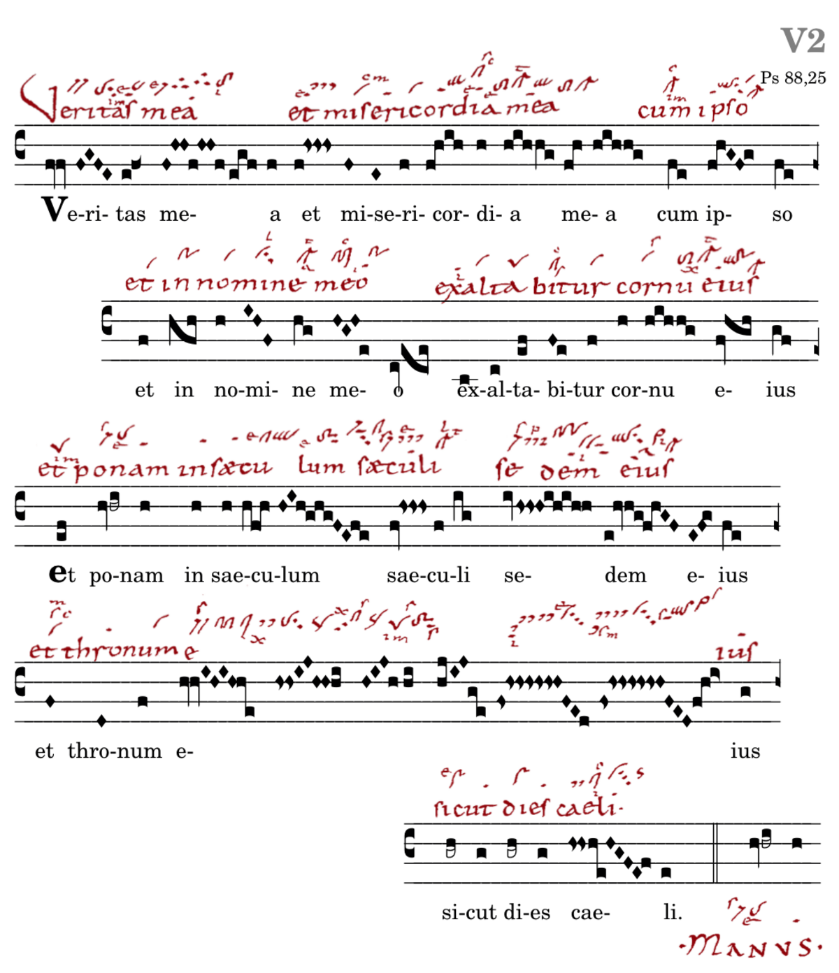 V2. Veritas mea / et misericordia mea / cum ipso / et in nomine meo / exaltabiltur / cornu eius / et ponam in saeculum saeculi / sedem eius et thronum eius / sicut dies caeli.