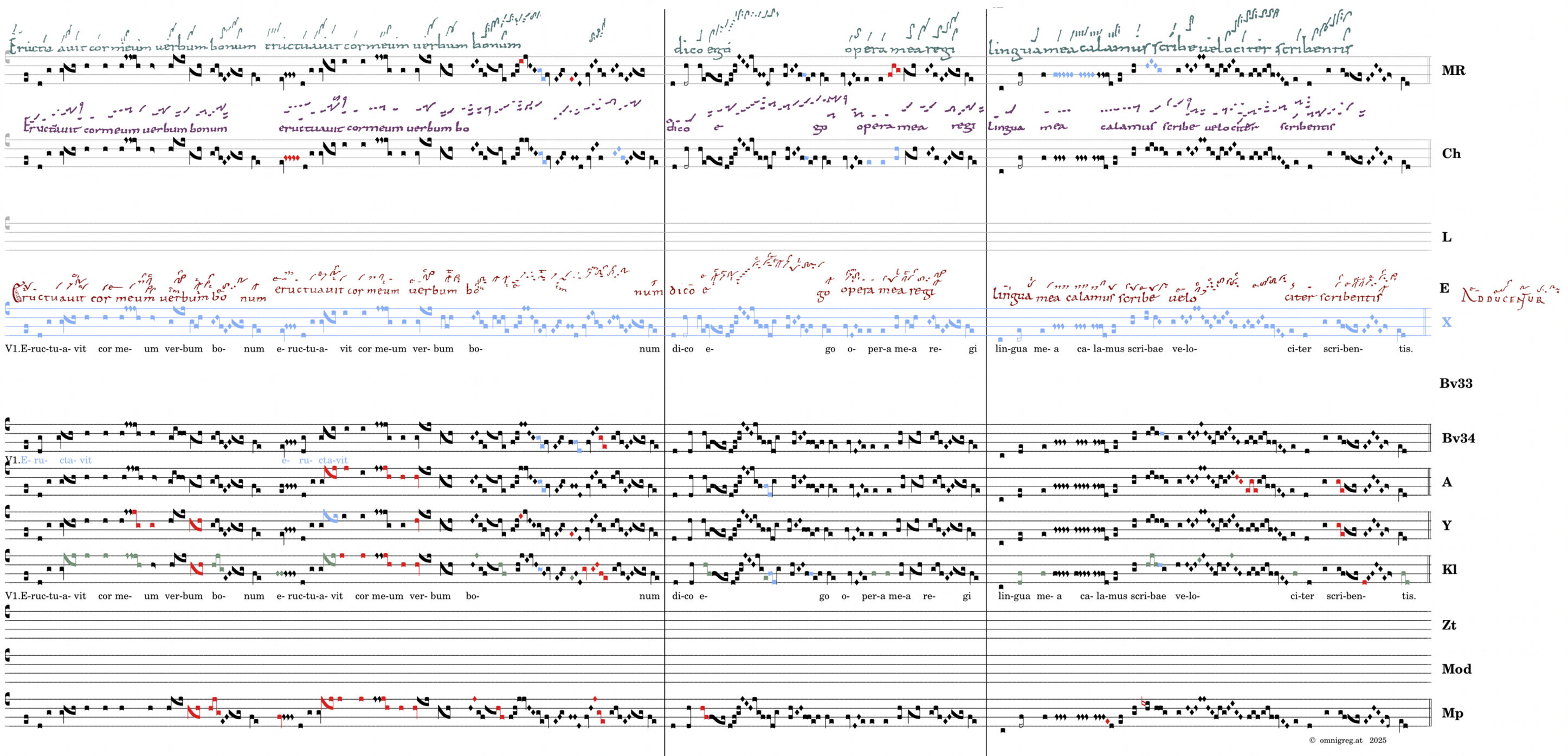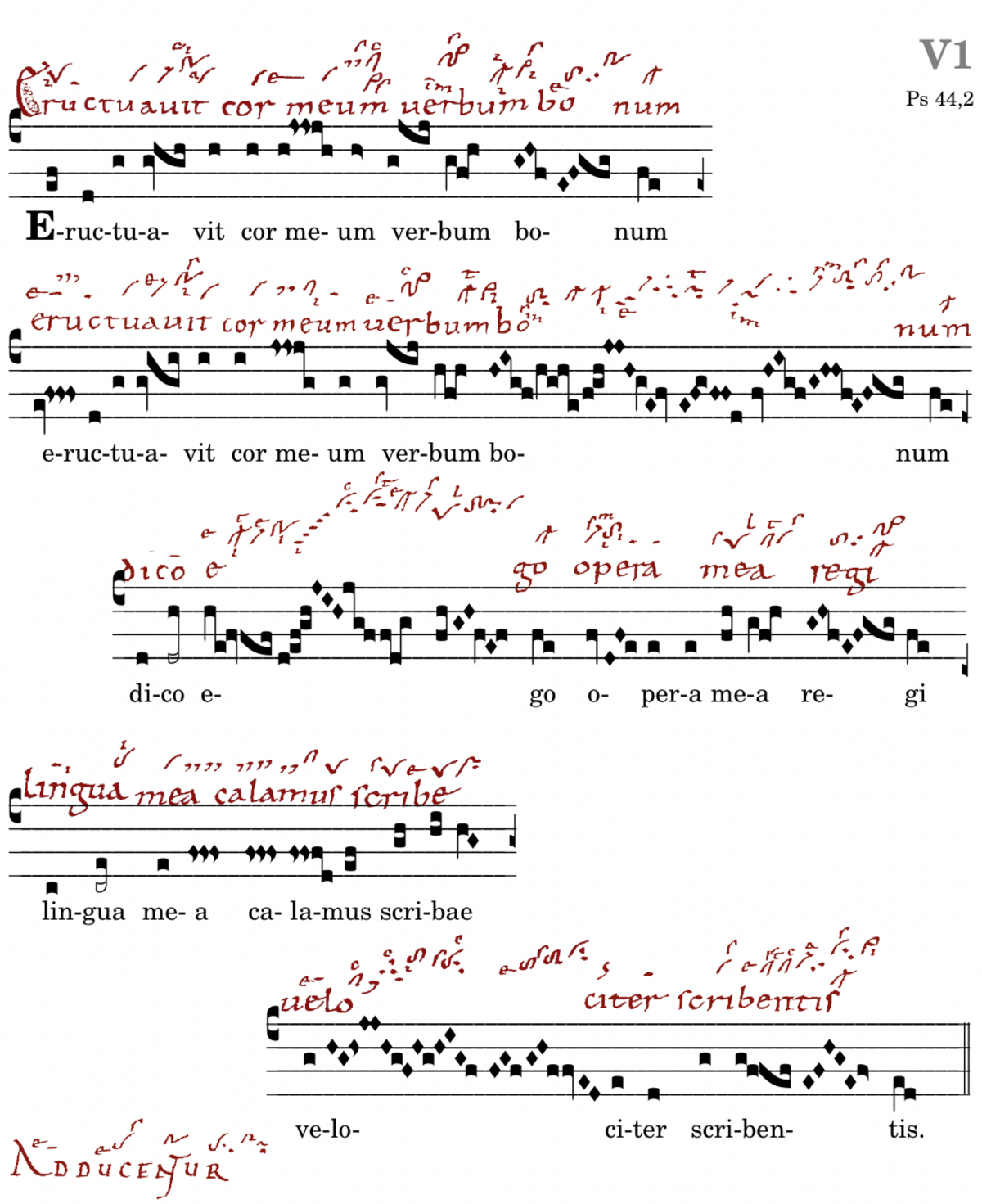 V1. Eructuavit cor meum verbum bonum / eructavit cor meum verbum bonum / dico ego opera mea regi / lingua mea calamus scribe / velociter scribentis.