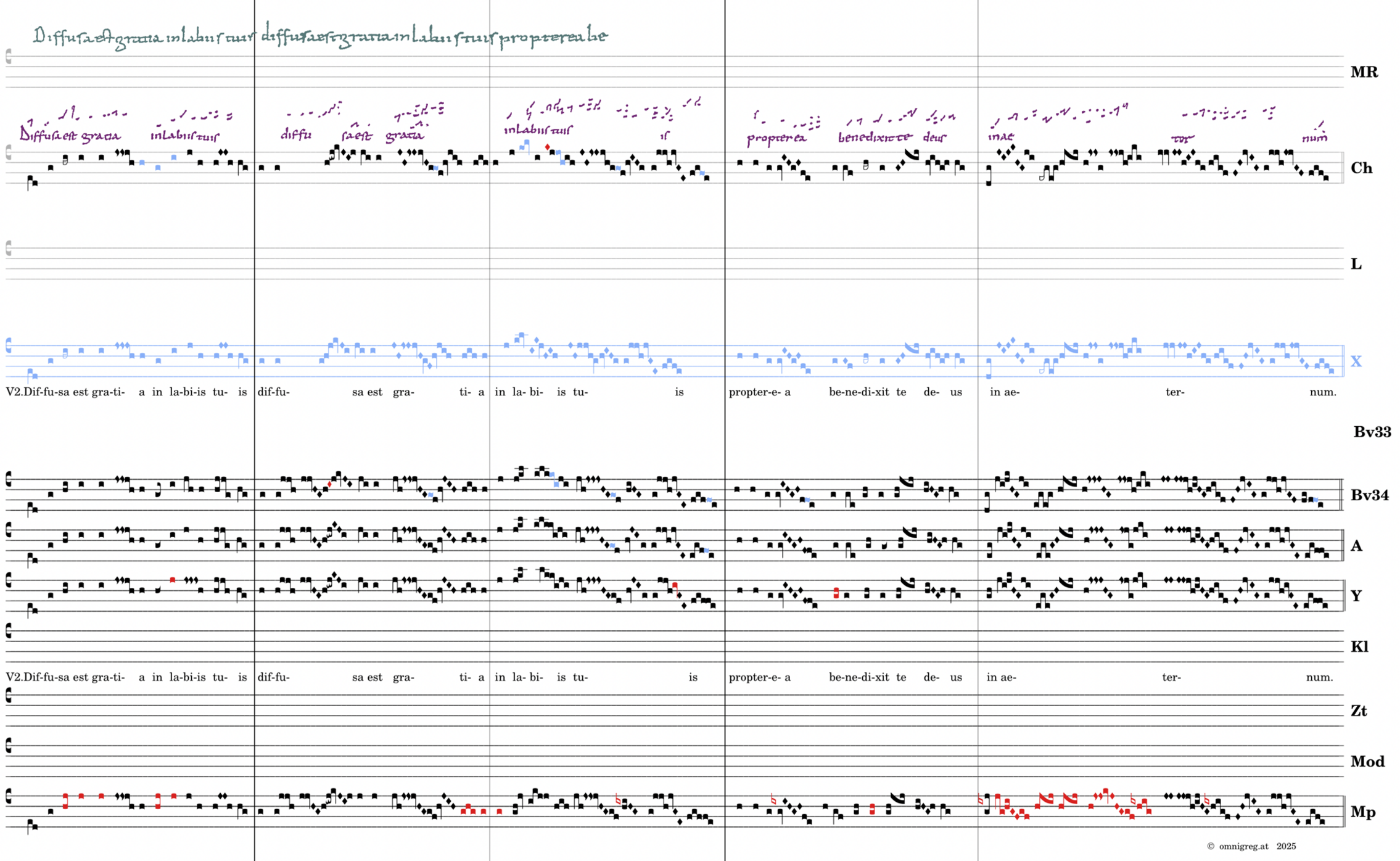 V2. Diffusa est gratia in labiis tuis / diffusa est gratia in labiis tuis / propterea benedixit te deus / in aeternum.