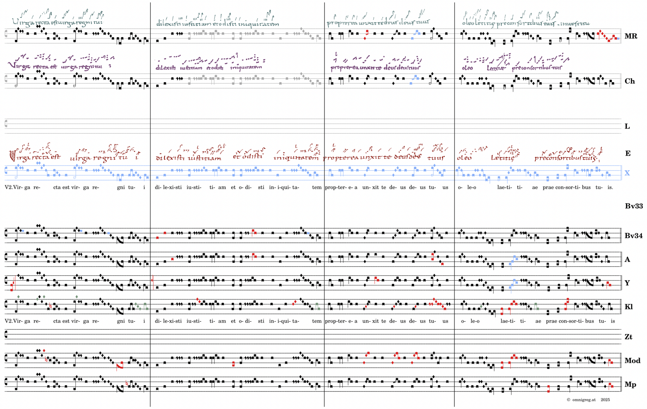 V2. Virga recta est / virga regni tui / dilexisti iustitiam / et odisti iniquitatem / propterea unxit te deus / deus tuus / oleo laetitiae / prae consortibus tuis.