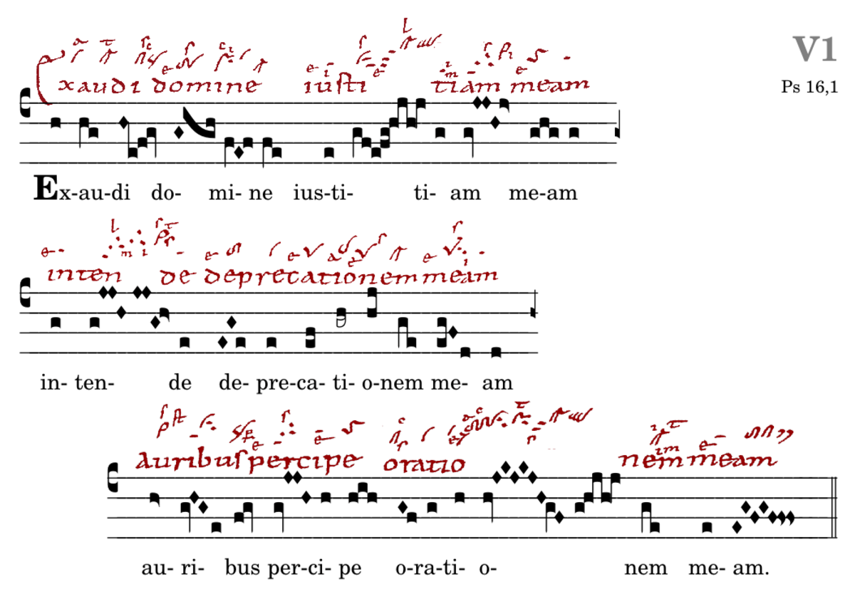 V1. Exaudi domine iustitiam meam / intende deprecationem meam / auribus percipe orationem meam.